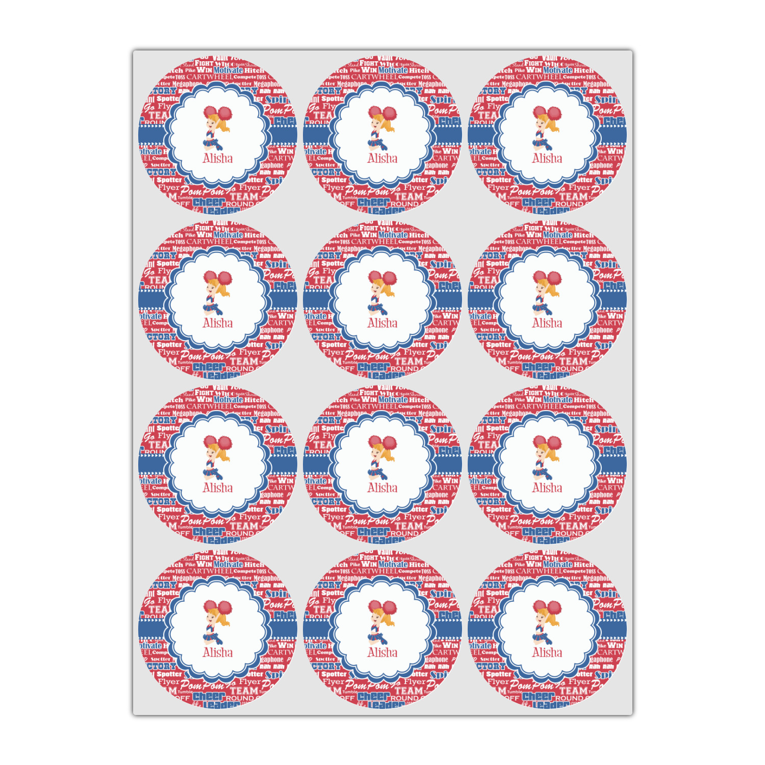 We chose a blue ribbon with hearts, along with a scalloped circle label; and then we chose a cheerleader graphic and with her name below for personalization. The cheerleader's uniform, hair and skin color can also be customized.