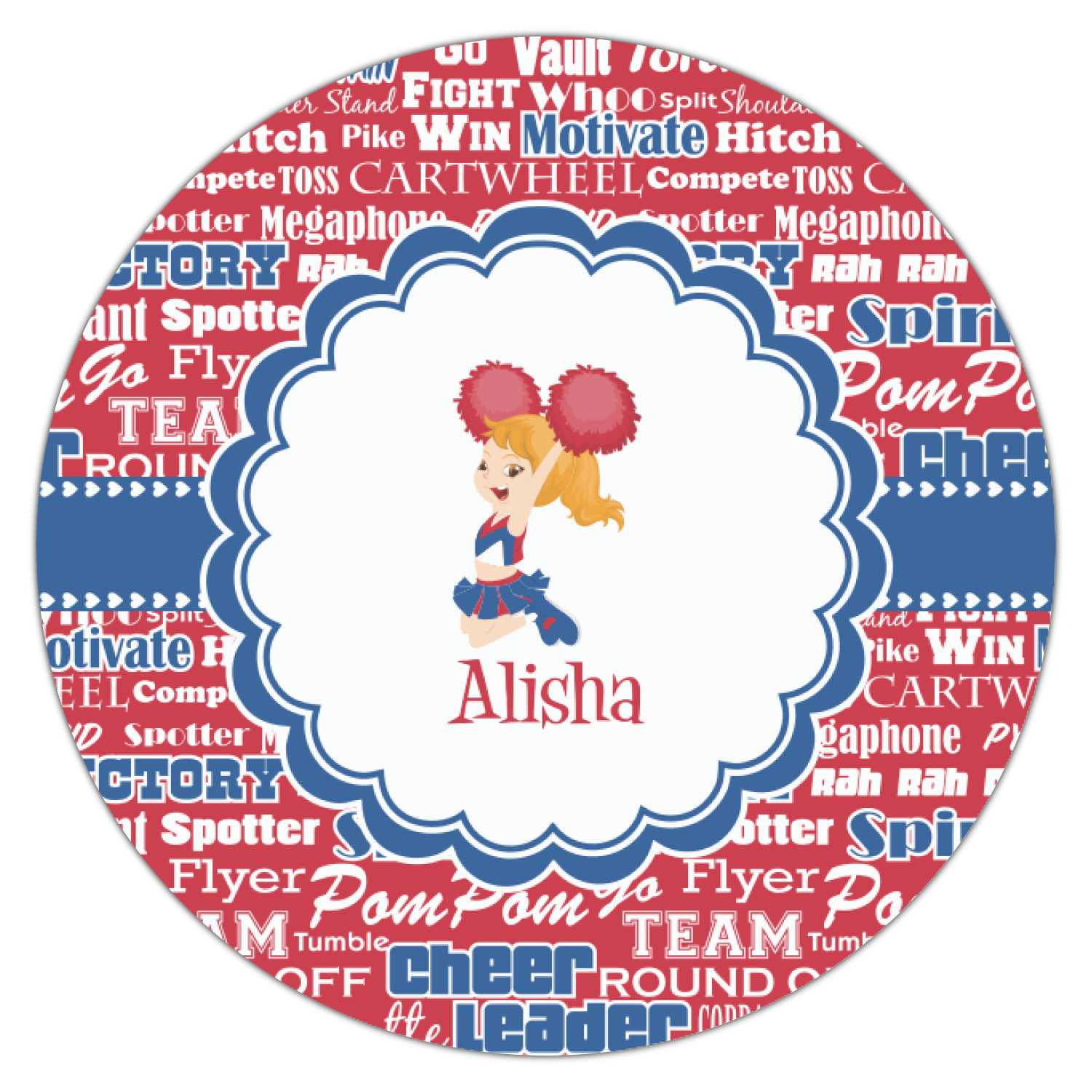 This design is perfect for cheerleaders. The background of the design is a word cloud of cheer words - words such as spirit, victory, team, cheer leader, pom pom and so many more. The background is fully re-color-able - so you can color it with your team's colors. We chose red, blue and white as those are our school's colors!