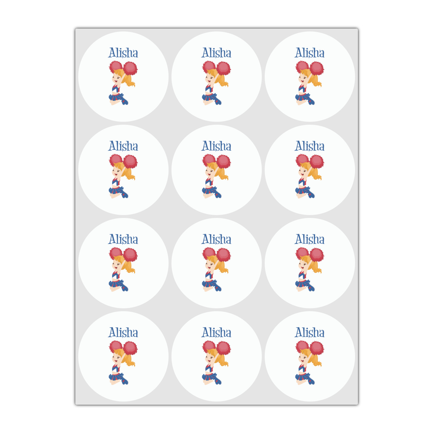 We chose a blue ribbon with hearts, along with a scalloped circle label; and then we chose a cheerleader graphic and with her name below for personalization. The cheerleader's uniform, hair and skin color can also be customized.