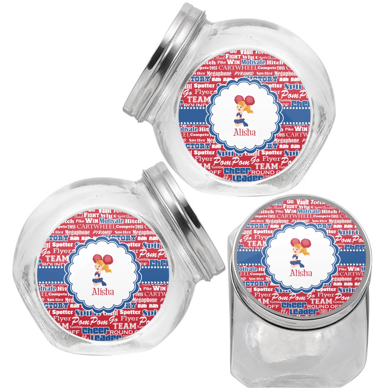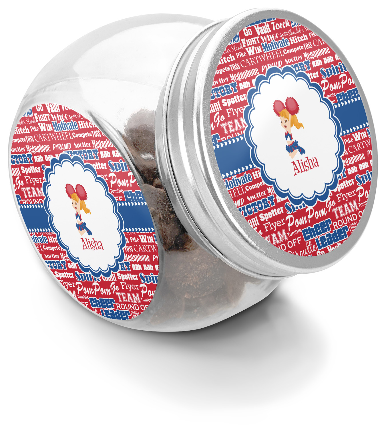 We chose a blue ribbon with hearts, along with a scalloped circle label; and then we chose a cheerleader graphic and with her name below for personalization. The cheerleader's uniform, hair and skin color can also be customized.