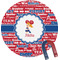 We chose a blue ribbon with hearts, along with a scalloped circle label; and then we chose a cheerleader graphic and with her name below for personalization. The cheerleader's uniform, hair and skin color can also be customized.