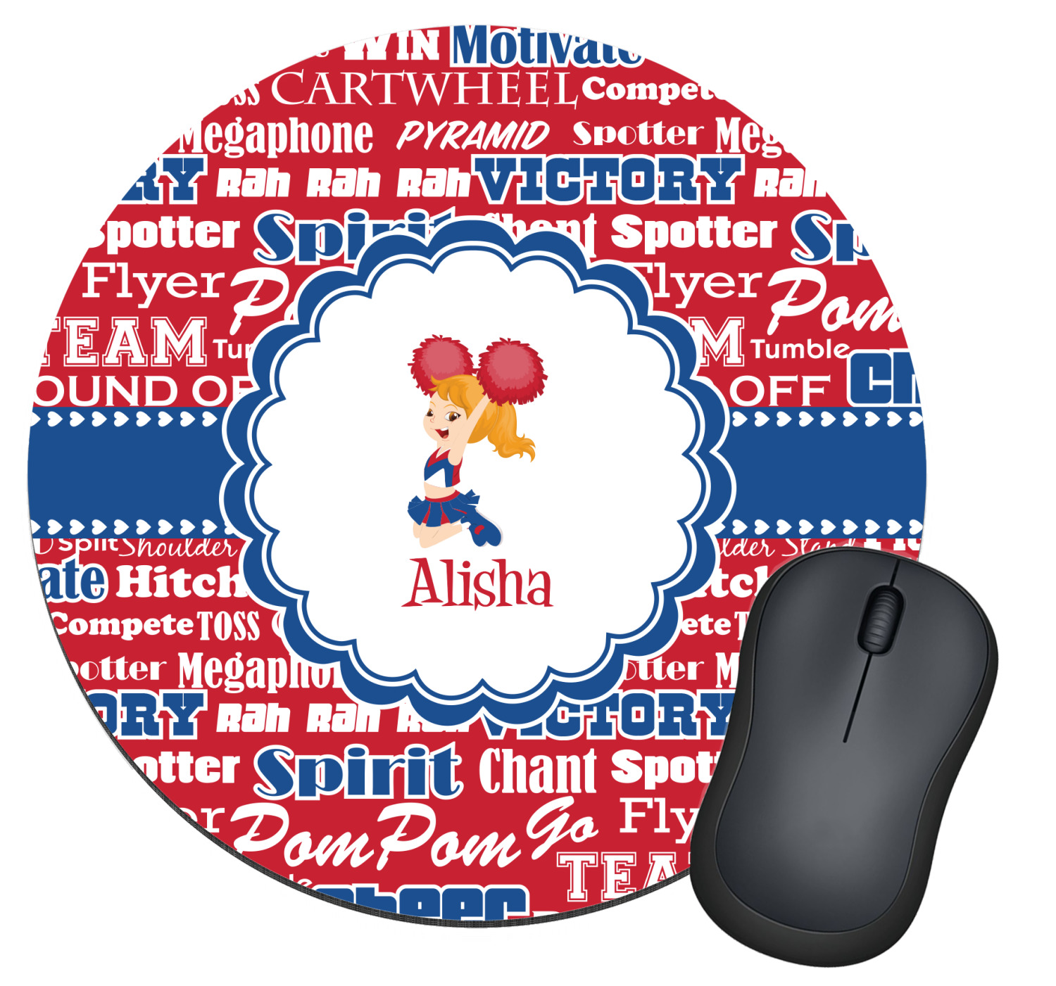 This design is perfect for cheerleaders. The background of the design is a word cloud of cheer words - words such as spirit, victory, team, cheer leader, pom pom and so many more. The background is fully re-color-able - so you can color it with your team's colors. We chose red, blue and white as those are our school's colors!