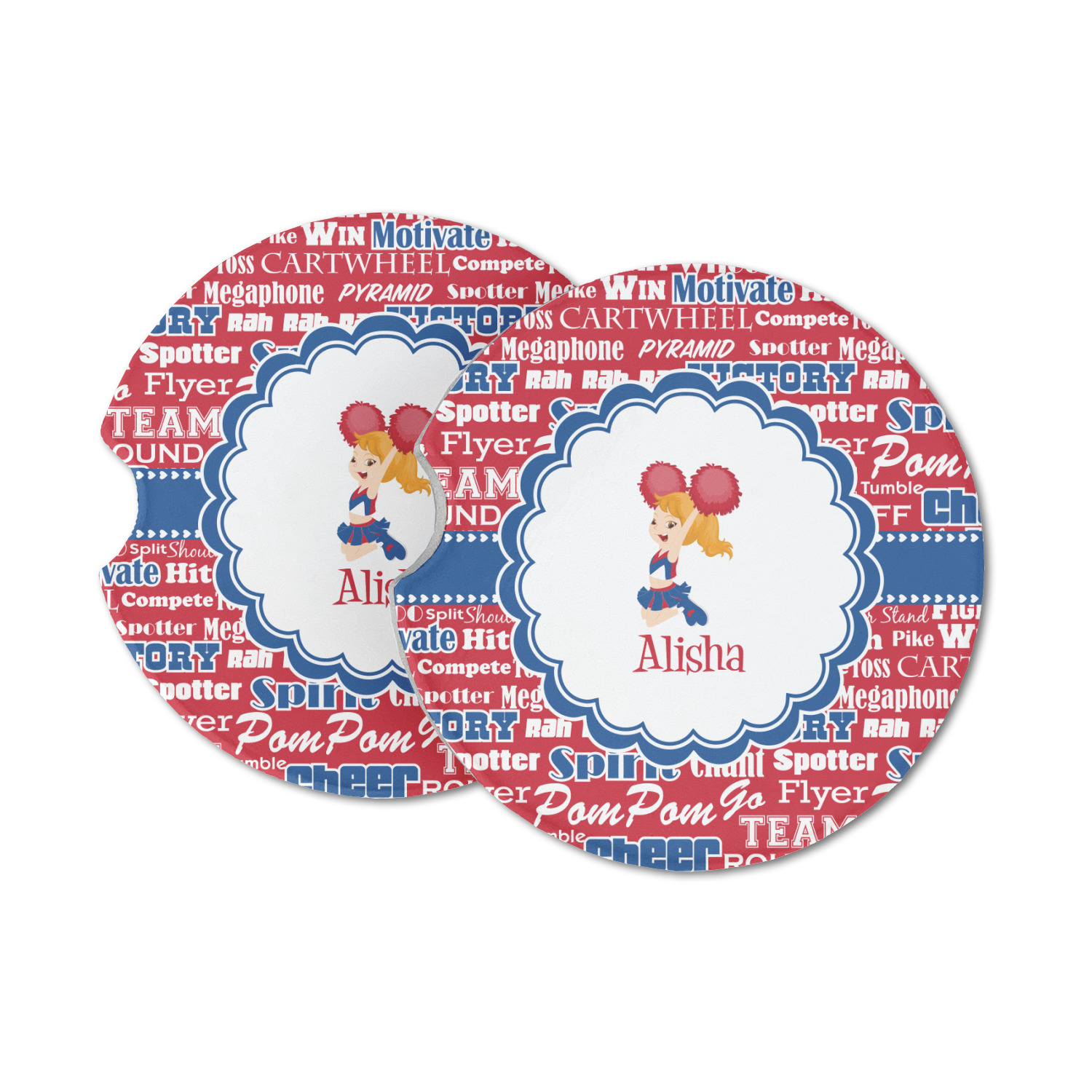This design is perfect for cheerleaders. The background of the design is a word cloud of cheer words - words such as spirit, victory, team, cheer leader, pom pom and so many more. The background is fully re-color-able - so you can color it with your team's colors. We chose red, blue and white as those are our school's colors!