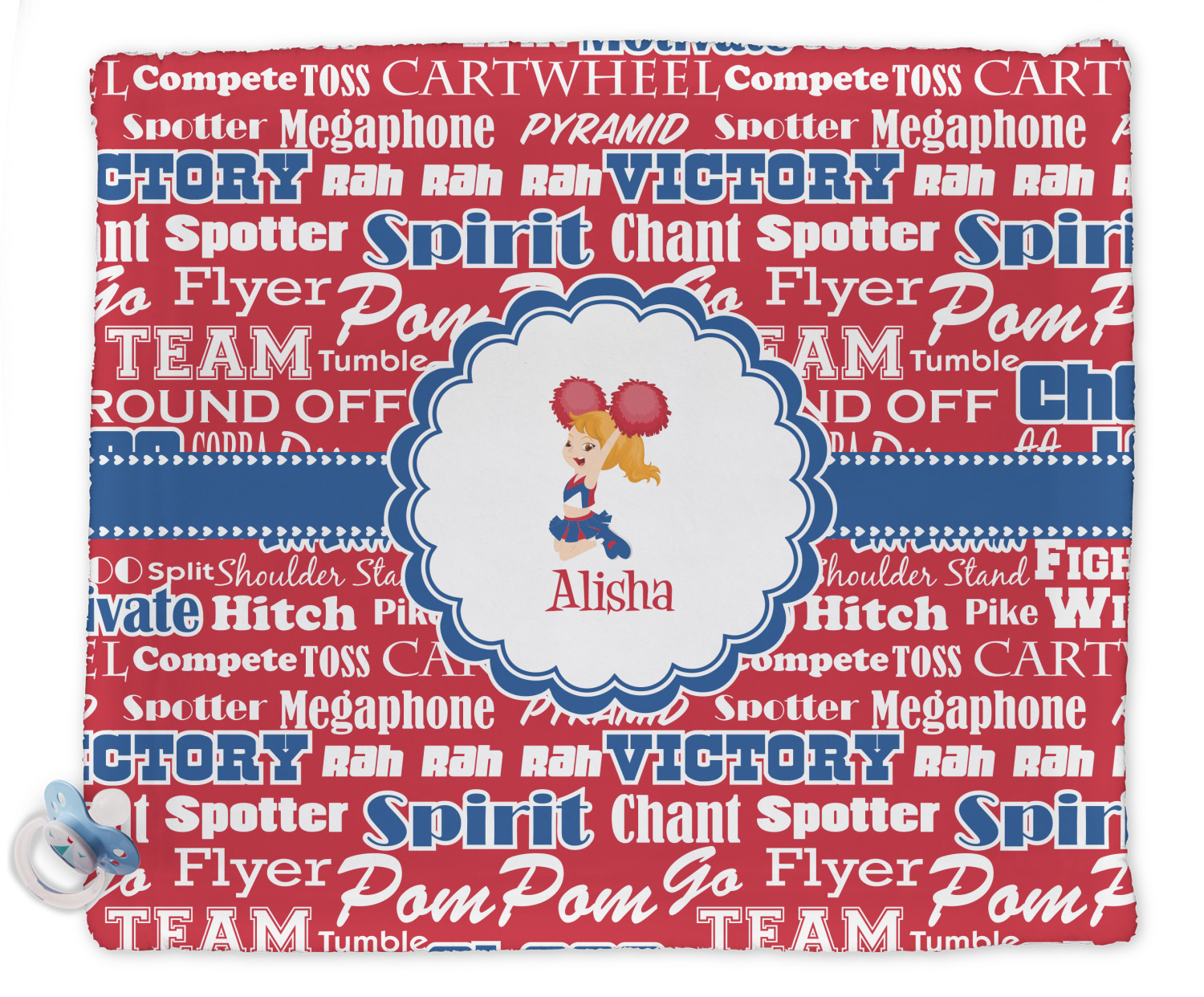 This design is perfect for cheerleaders. The background of the design is a word cloud of cheer words - words such as spirit, victory, team, cheer leader, pom pom and so many more. The background is fully re-color-able - so you can color it with your team's colors. We chose red, blue and white as those are our school's colors!
