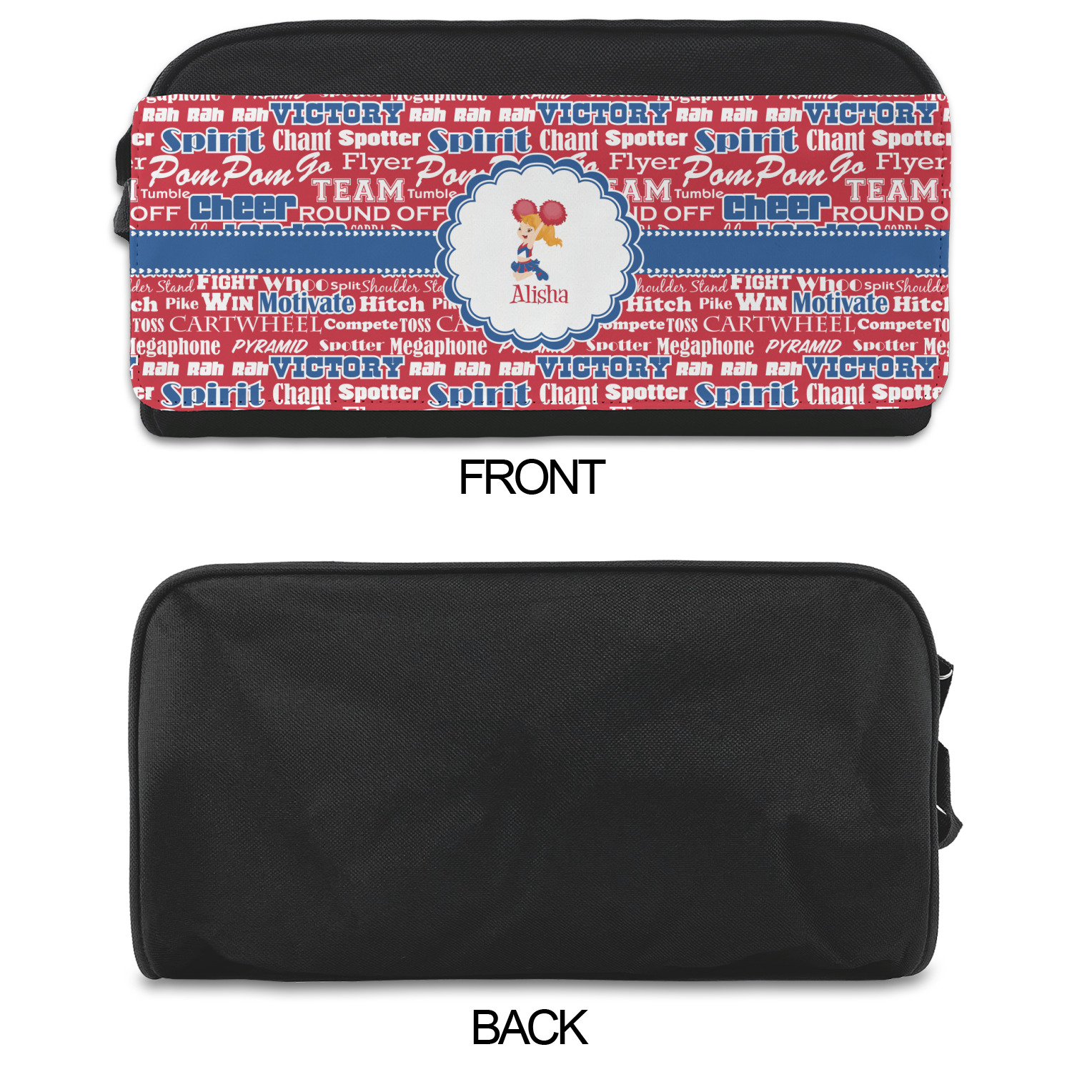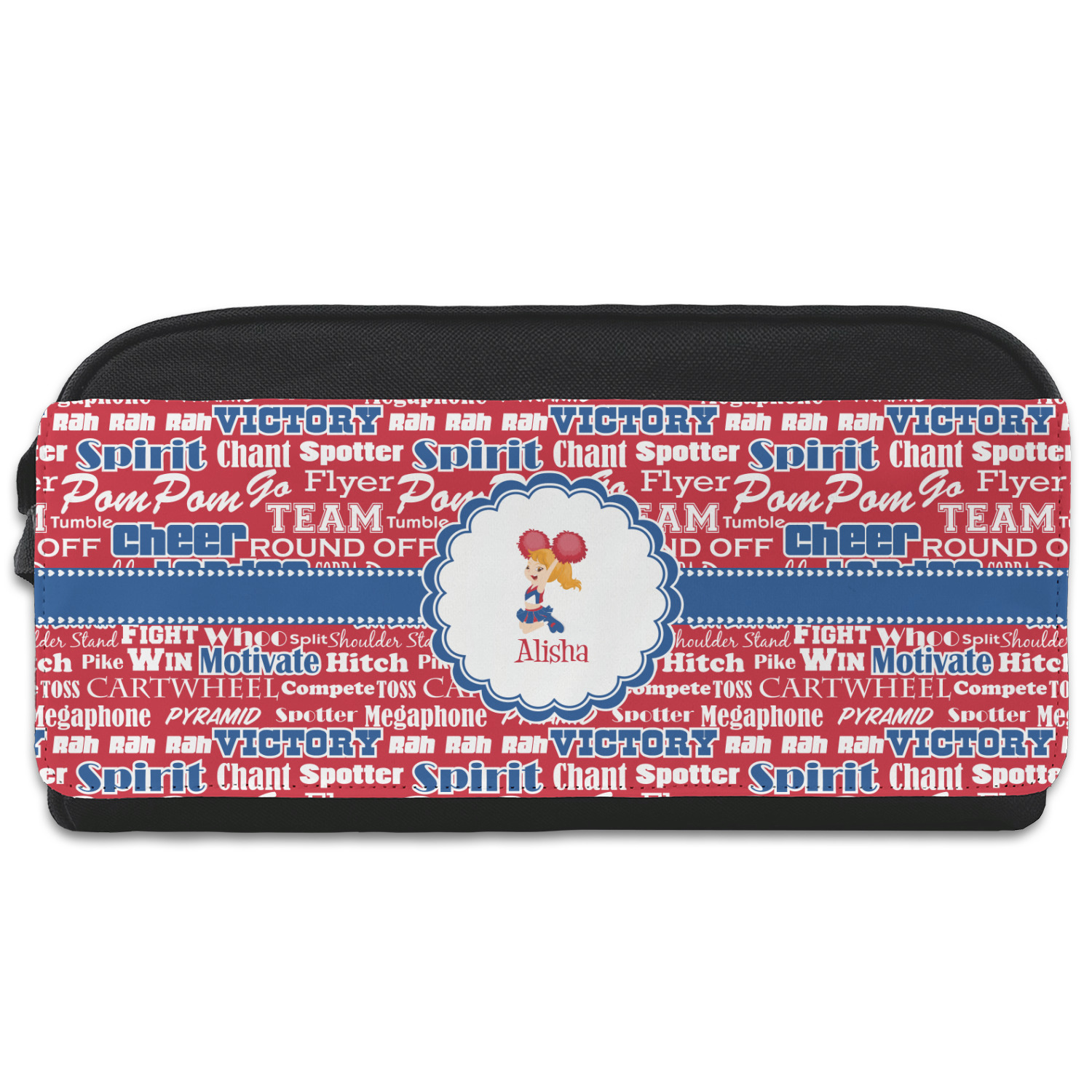 This design is perfect for cheerleaders. The background of the design is a word cloud of cheer words - words such as spirit, victory, team, cheer leader, pom pom and so many more. The background is fully re-color-able - so you can color it with your team's colors. We chose red, blue and white as those are our school's colors!
