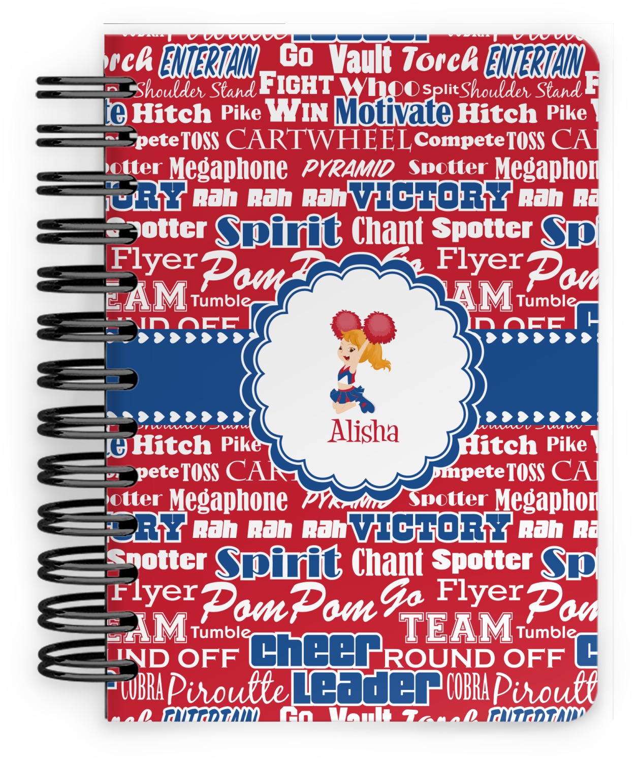 This spiral notebook includes 75 sheets of thick, ruled paper. The front and back of this custom notebook is made of a robust, laminate, plastic covering. We print your personalization on these two panels, underneath a glossy finish, which emphasizes the colors of your design. The two panels and the sheets of paper are held together by a sturdy, black coil. The paper within your bound notebook is perforated for easy, clean tearing.