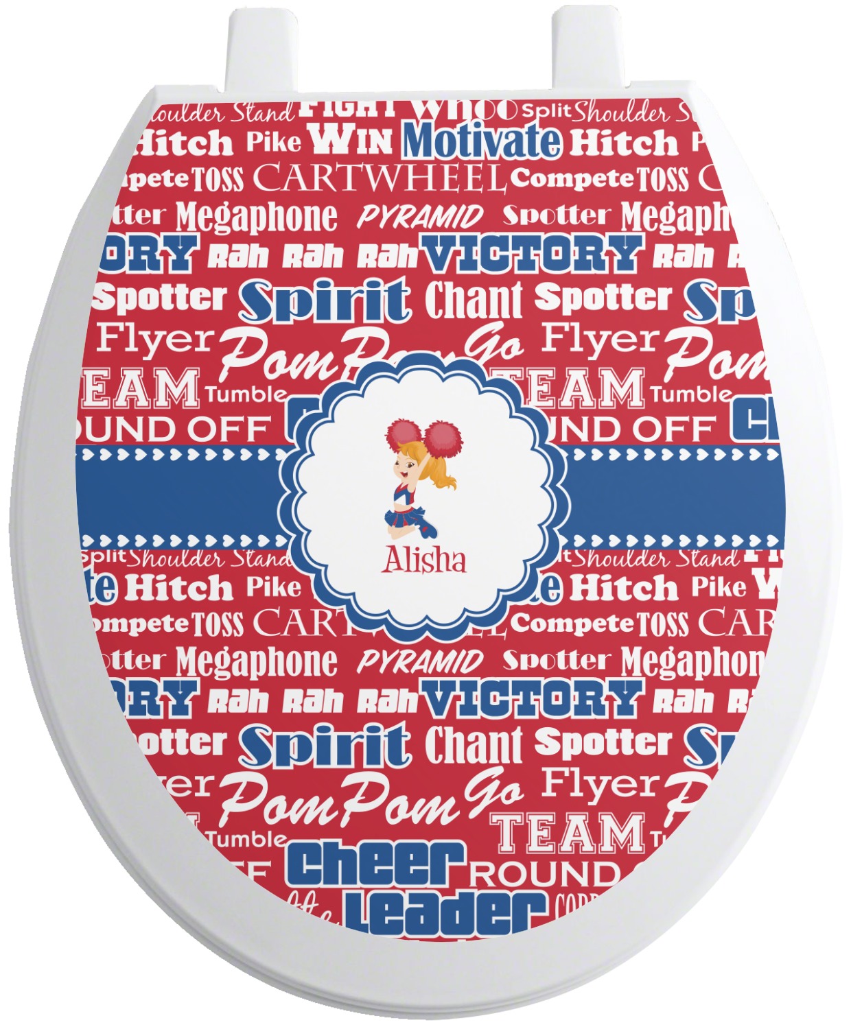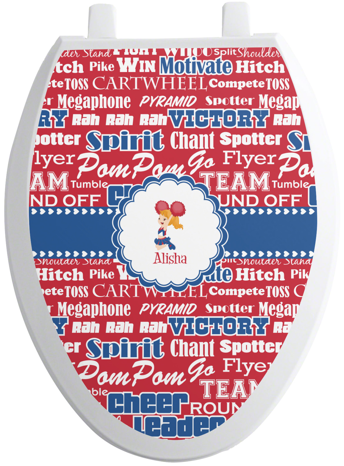 This design is perfect for cheerleaders. The background of the design is a word cloud of cheer words - words such as spirit, victory, team, cheer leader, pom pom and so many more. The background is fully re-color-able - so you can color it with your team's colors. We chose red, blue and white as those are our school's colors!