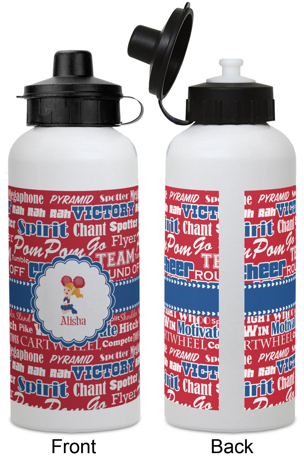 This design is perfect for cheerleaders. The background of the design is a word cloud of cheer words - words such as spirit, victory, team, cheer leader, pom pom and so many more. The background is fully re-color-able - so you can color it with your team's colors. We chose red, blue and white as those are our school's colors!