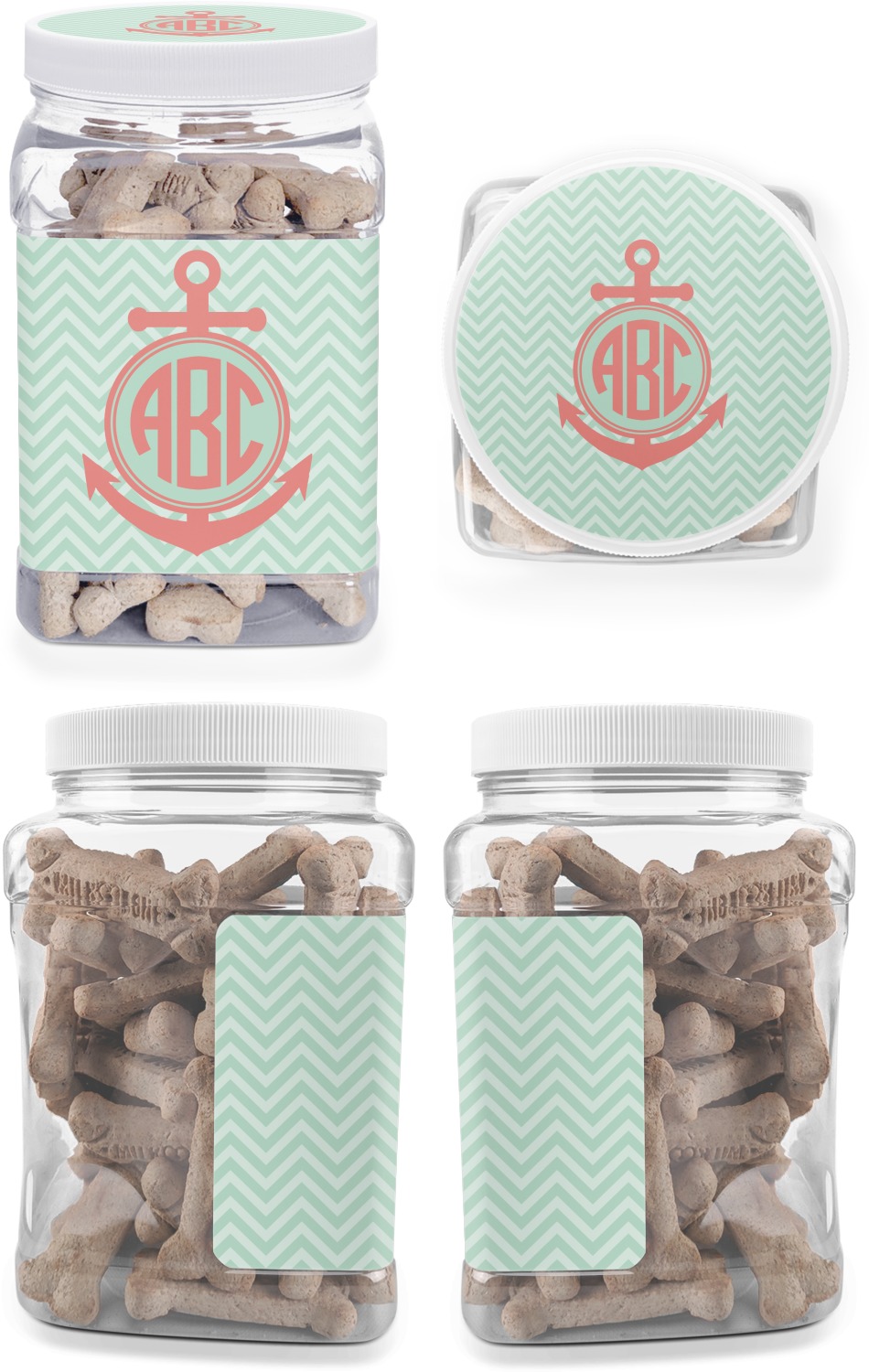 This half gallon jar, made from a sturdy plastic, is the perfect way to keep treats from any naughty pet paws, while still keeping them ready on hand for when your pup performs an impressive trick. This dog cookie jar features a screw-on, white lid that displays your personalized design on a vinyl sticker. We apply another customized sticker that wraps around the front and sides of the jar. Our dog treat jar also has indentations on the rear ends of the sides, which allows for convenient handling, and its square frame allows for easy storage.