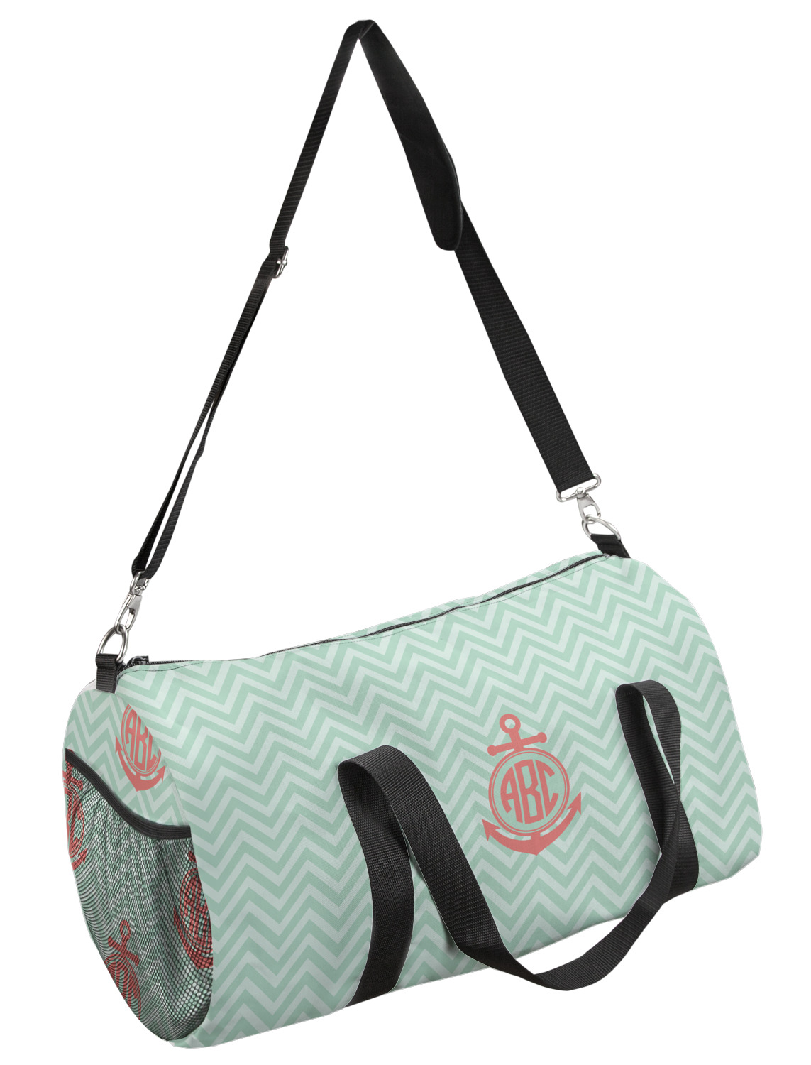 This duffle is a sturdy bag made of a canvas material. It comes in two sizes: Small (19"W x 9.5"H x 9.5"D) and Large (23"W x 12"H x 12"D). The bag is a cylindrical shape with a black adjustable strap and two handles. On one side is an elastic pouch to put a waterbottle or other small item. Your product will be sublimated with your design and is able to be designed on the front, back, and sides. Be sure to remember that the straps may cut into parts of your design if you upload your own artwork.