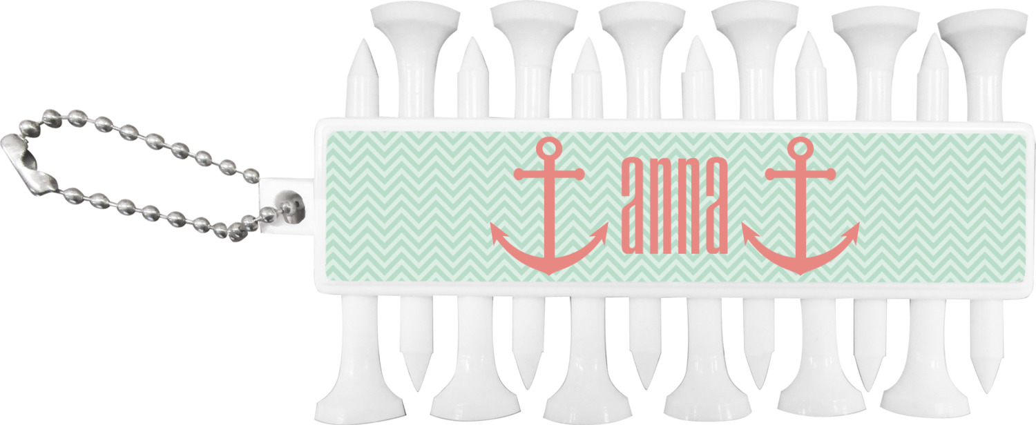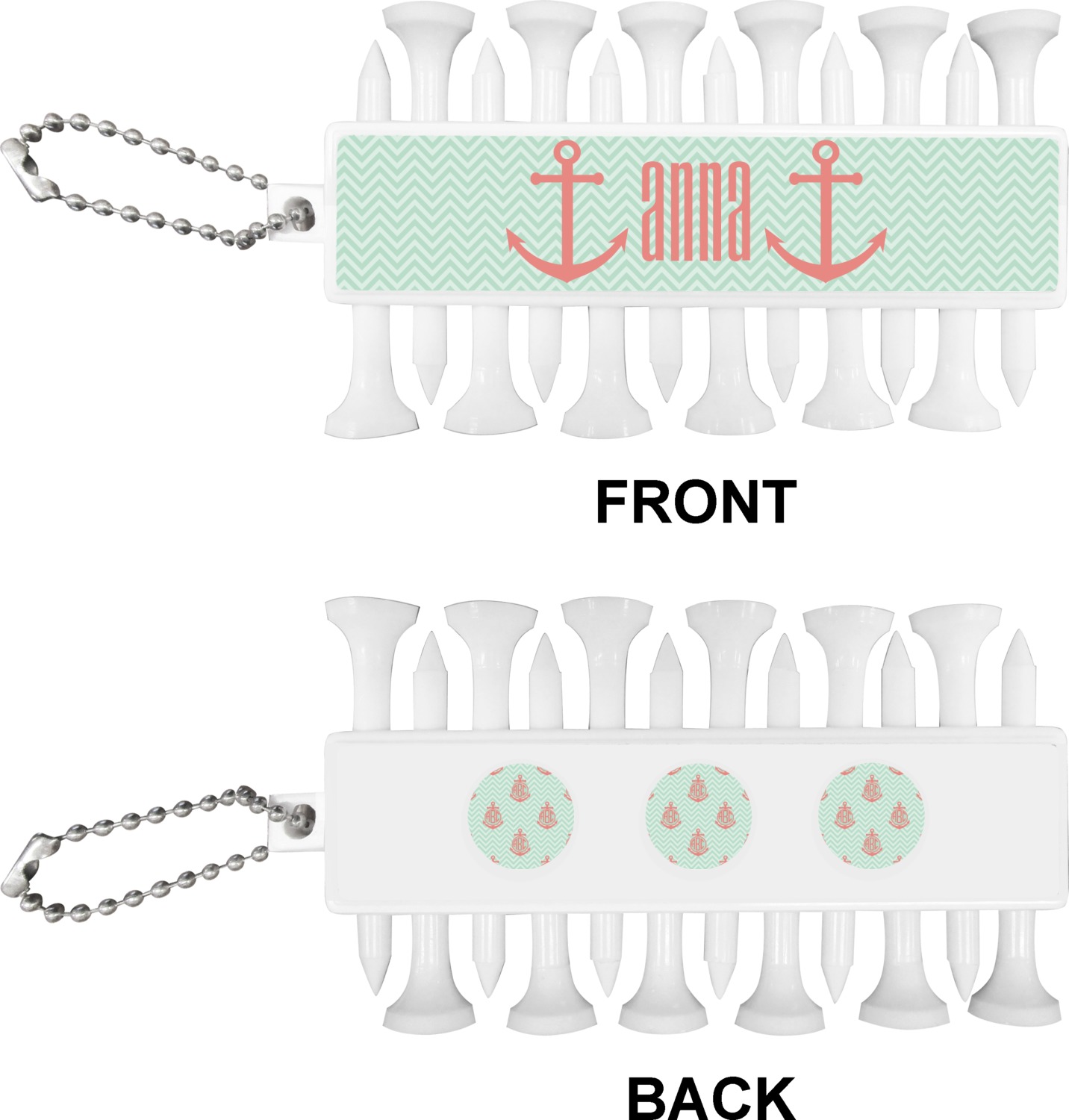With 12 tees on a lightweight, portable key chain, it almost ensures a great 18 holes. Our tees are made of white plastic and are a little over 2". Design the front and the back of the golf tee holder. Pick from over a hundred designs, colors, and personalization styles! The set even comes with three removable ball markers as well!