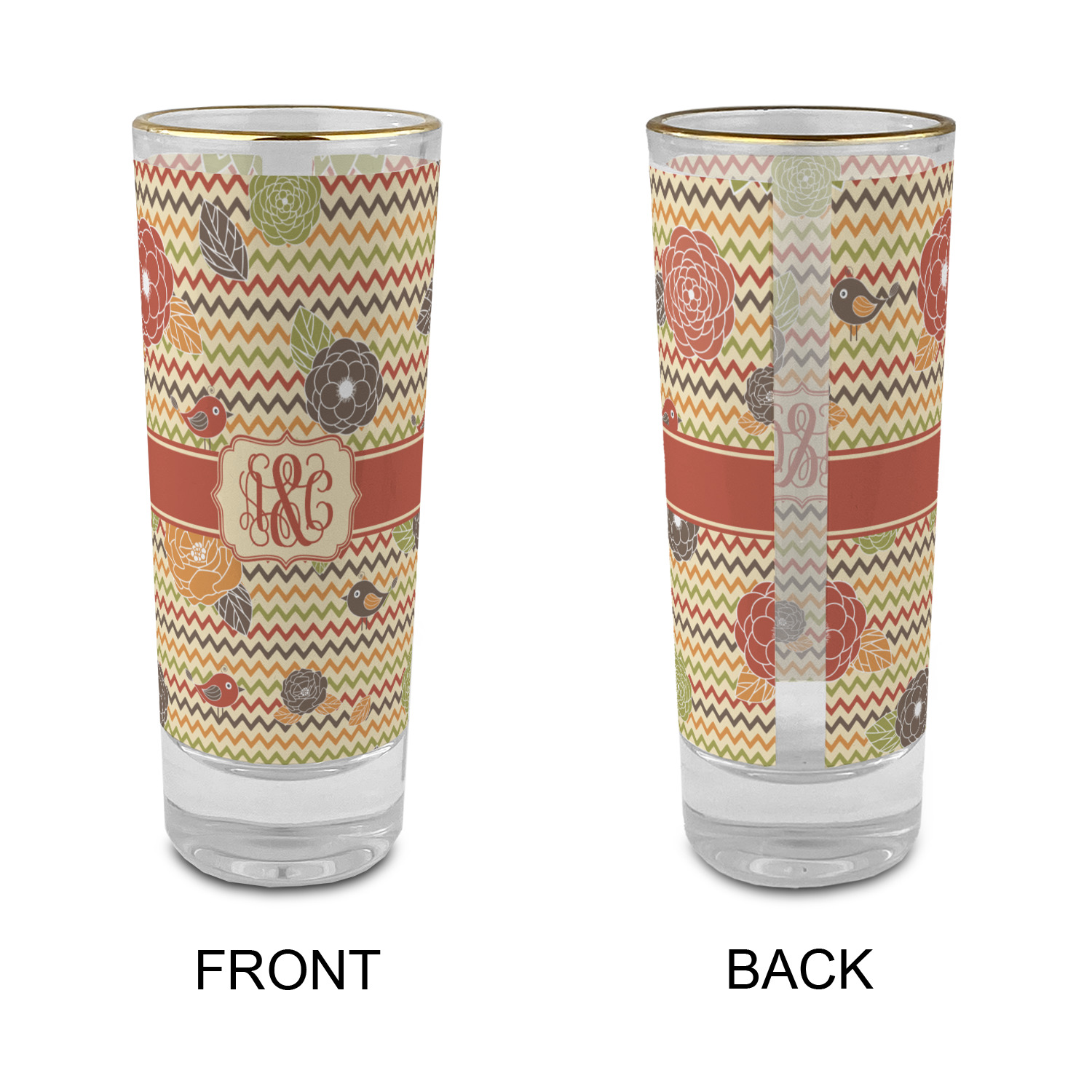 These glass shooter glasses are printed in full color with the design of your choice. These are a tall shooter 2 oz size and stand 4" tall. The print is a full wrap design to boldly display your personalization.
