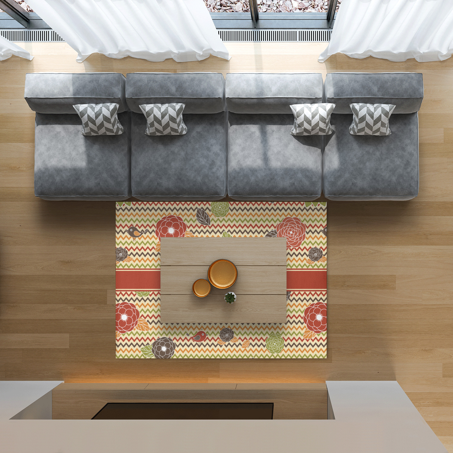 This a layered design with chevron and flowers in rich fall colors. The background has chevron, while the foreground has simple, yet elegant flowers and birds. We thinks it creates an absolutely stunning design.