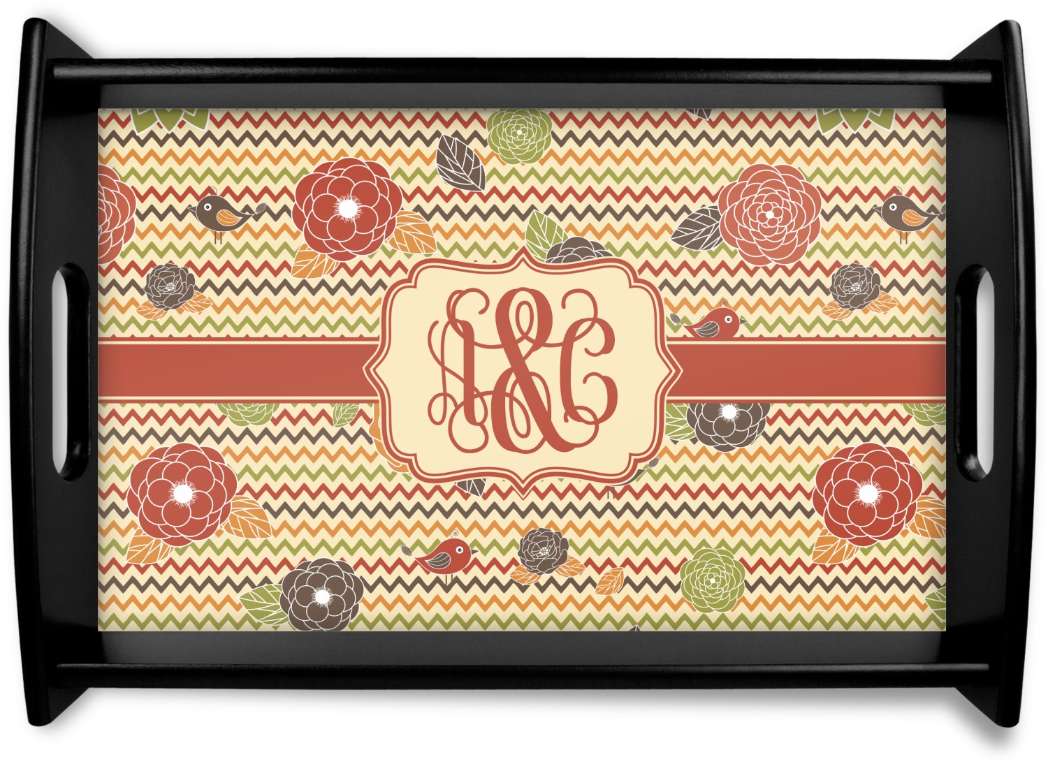 This serving tray with handles features square edges and two rounded sides, creating a very modern look. Each side is fabricated from a beautifully cut, natural wood. The bottom of the interior of the tray displays your customized design in bright, vibrant color. The tray is sold in both a black color and a natural wood look. Each variation of the wood serving tray has two sizes: Small, which is 14" x 10" x 2.25", and Large, which is 19.5" x 13.5" x 2.75".