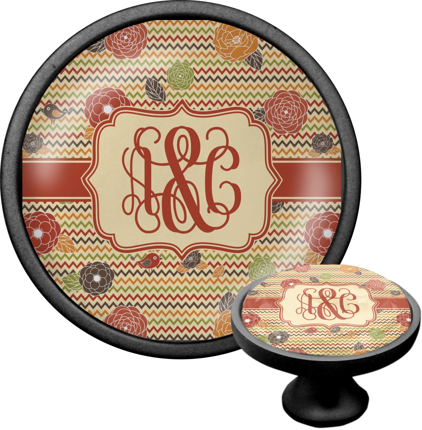 We sell these cabinet pulls in two different colors to better match your room's color scheme. We offer an oil-rubbed bronze base that is black in color, and a satin nickel option, which has a silver color. Your design is displayed across a high gloss vinyl insert that is placed on top of these cabinet handles. We then place a 1 inch thick glass cabochon atop the design, which seals the cabinet knob and makes the colors of your customization stand out. These custom cabinet knobs are approximately 1.3 inches in diameter. Your purchase includes a 1 inch screw that can be used to mount the knob to any cabinet in your home.