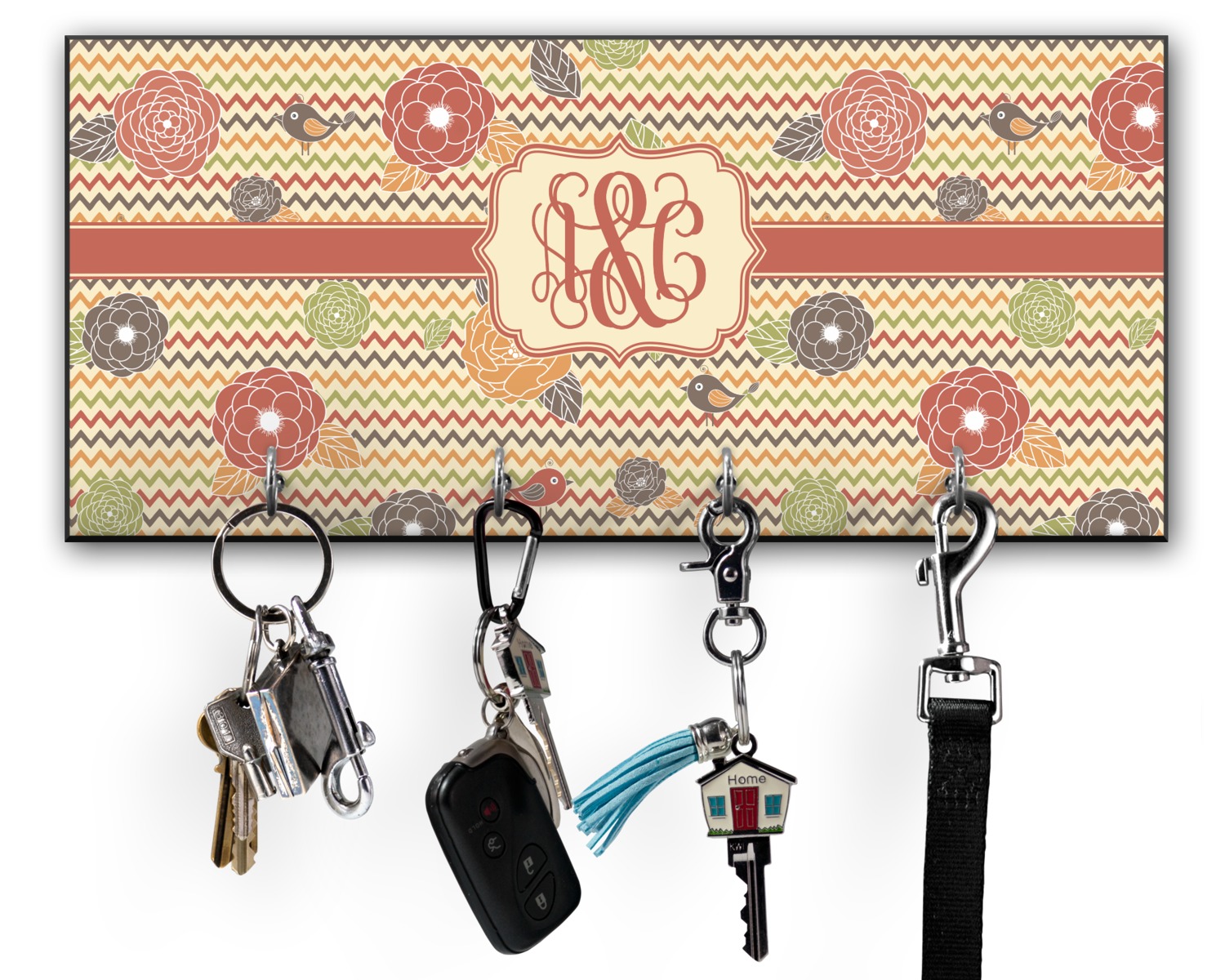 This 11" x 5" key hanger is made of sturdy wood and has four metal hooks lining the bottom. This is the perfect size for a family with several drivers. Not only can you hang keys on it though, but pet leashes and other small items. The board is black on the sides and back and is printed with the design of your choice on the front.