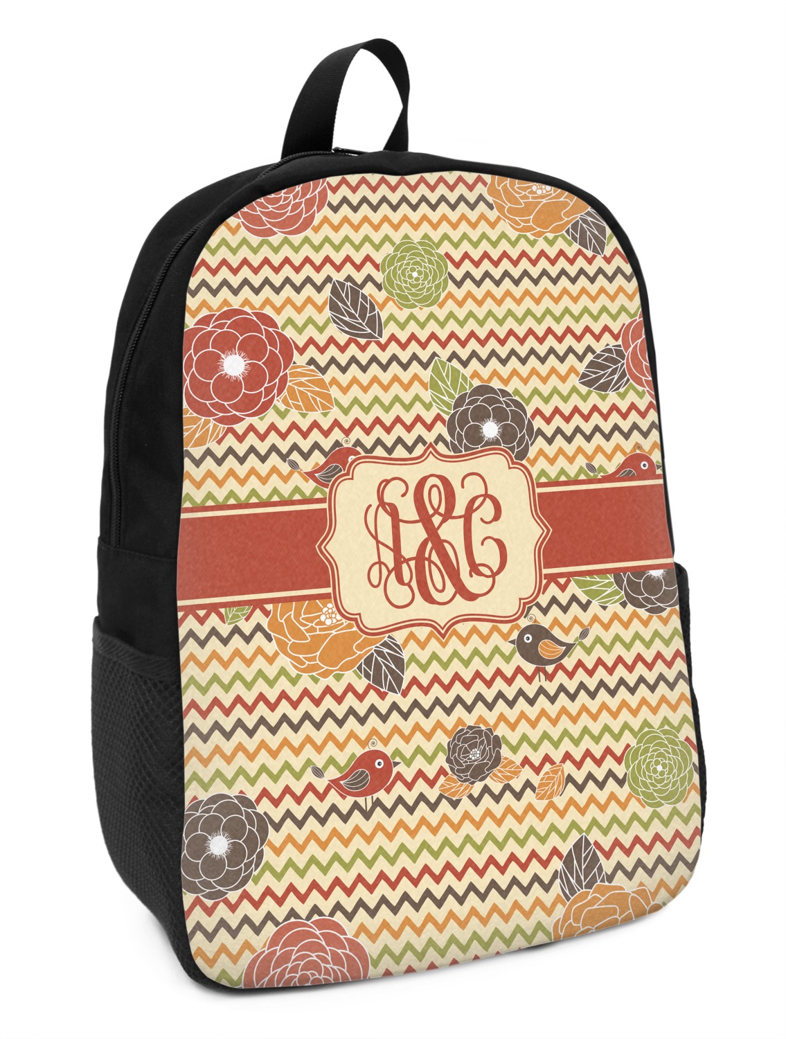These small backpacks are made of a durable black canvas material with your personalization right on the front. The two shoulder straps are padded and easily adjustable. The bag itself measures at about 11" W x 15" H x 5" D. It's the perfect size for elementary aged kids or adults who want a smaller backpack. On the top of the bag you will find a handle to hang or carry your backpack by as well as a large zipper closure to keep all of your belongings safe inside. On each side of your backpack is a mesh pocket for a small item or water bottle. Inside your backpack you will find a spacious area with a small zipper pocket and a padded laptop slot that will fit up to a 13" laptop (13" being very snug). This is the perfect bag for any student that needs a couple books and their laptop with them at all times. It also works great as a carry on for traveling!