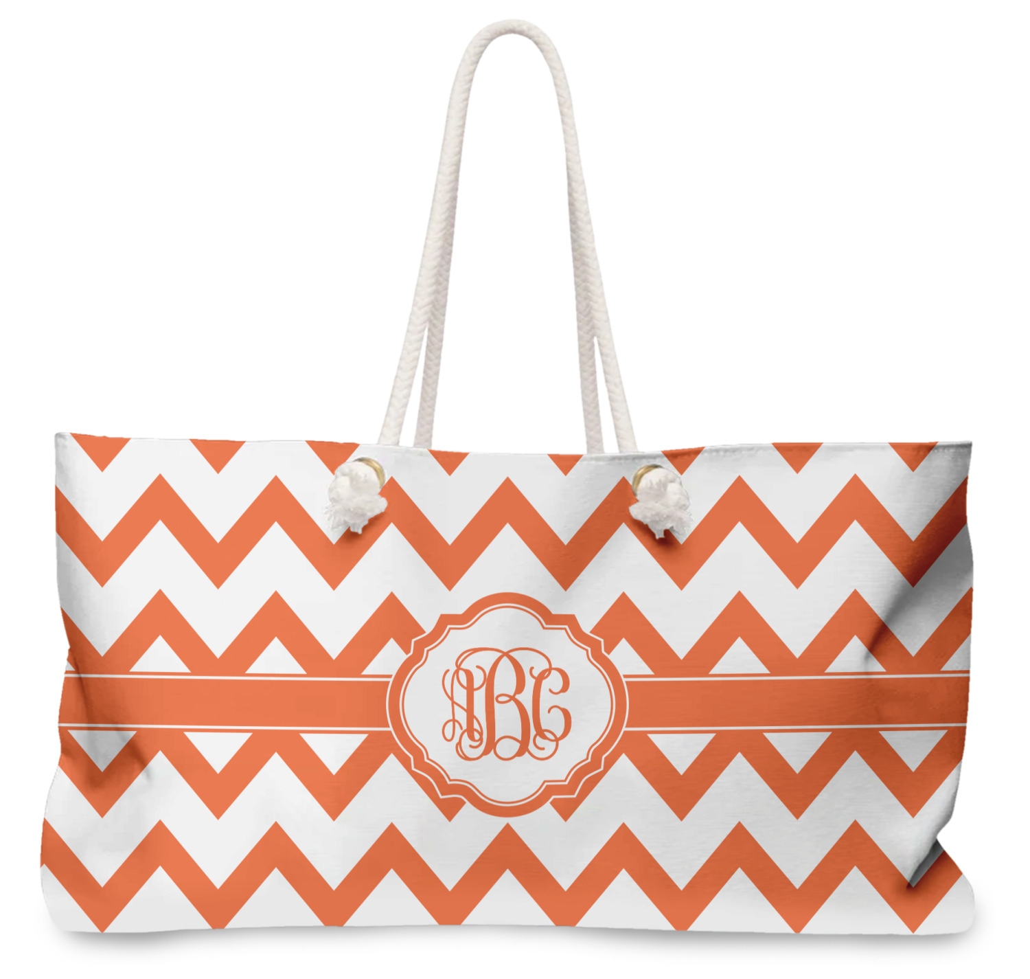 Our oversized weekender tote with rope handles is perfect for your weekend at the beach or on the town. This large tote are 24" W X 13" H, with a 5" gusset and a 27" thick rope handles with a knot that is put through a grommeted brass hole.