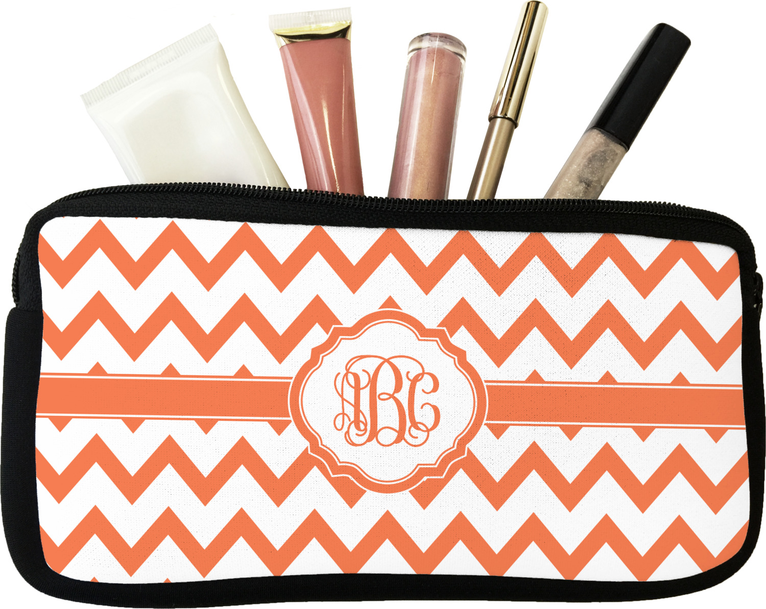 Our personalized makeup bags are available in many different designs, patterns and colors - so you are sure to find one that will love. They are made of neoprene (same material as wet-suits) and thus are water resistant, so spillages in your makeup bag will not end up all over you purse. They are customized on one side and are black on the other side and the zipper is black as well.