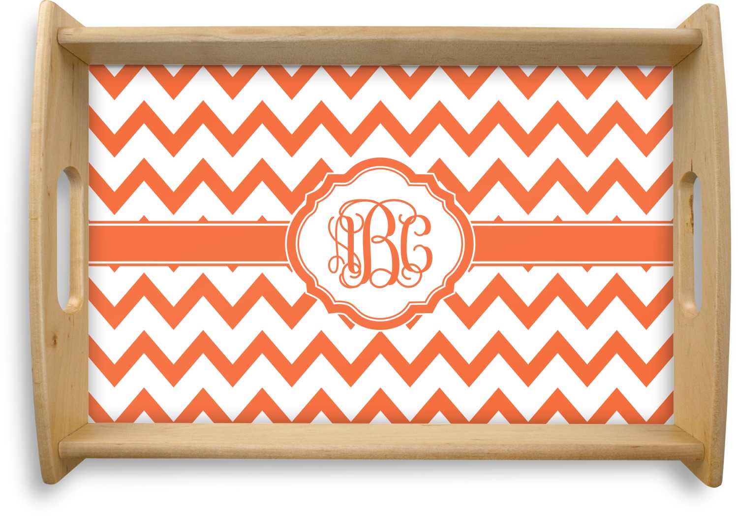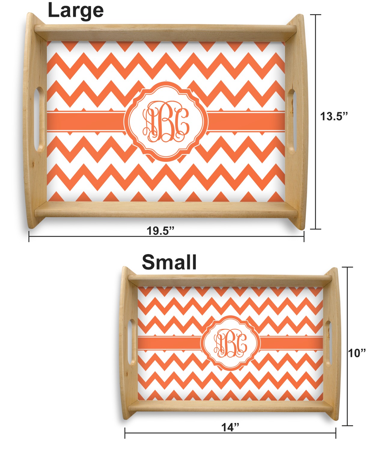 This serving tray with handles features square edges and two rounded sides, creating a very modern look. Each side is fabricated from a beautifully cut, natural wood. The bottom of the interior of the tray displays your customized design in bright, vibrant color. The tray is sold in both a black color and a natural wood look. Each variation of the wood serving tray has two sizes: Small, which is 14" x 10" x 2.25", and Large, which is 19.5" x 13.5" x 2.75".