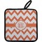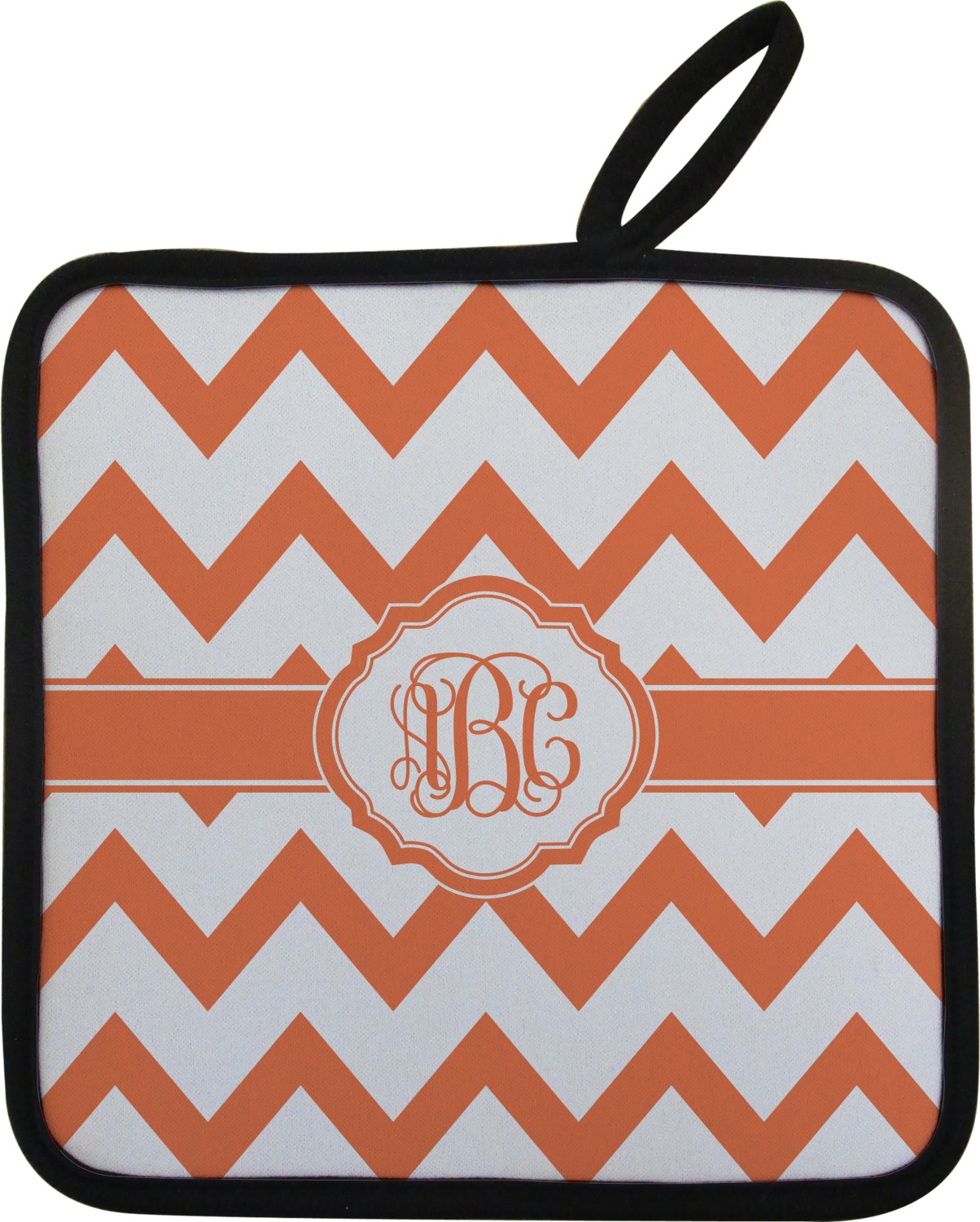 Our personalized pot holders feature a neoprene front that displays your personalization in vibrant colors. The backing of the hot pot holder is rubberized; the textured backing allows you to have a great grip when using this custom pot holder. The two materials are joined with a sleek, black trim, and the holder also includes an attached loop for hanging and storage. The pot holder is approximately 8.75 inches by 8.75 inches and 0.25 inches tall, while the fabric loop is 2.5 inches long. You can purchase a kitchen pot holder by itself or as a set of 2. We also offer a set including one pot holder and one oven mitt.