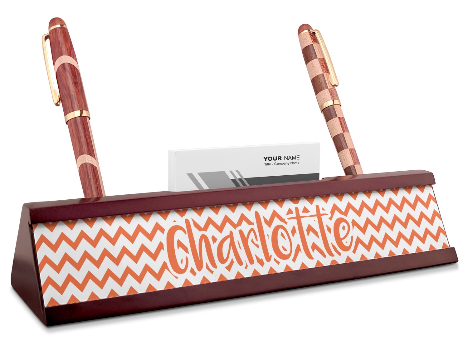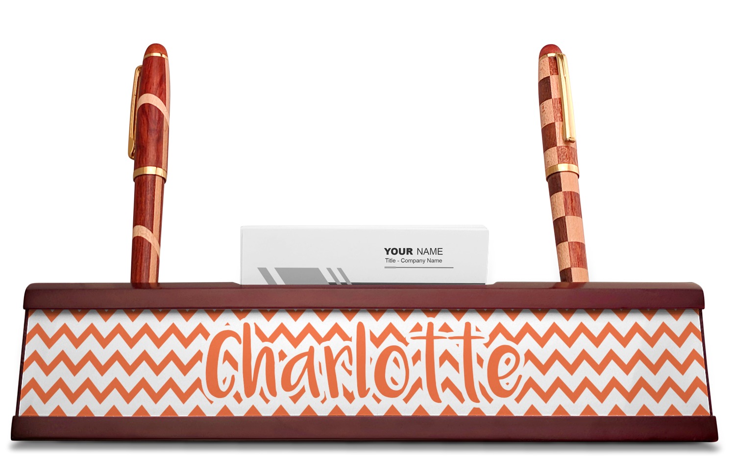 Your desk name plates are crafted from a high-quality, dark-cherry mahogany. At approximately 9.5 by 1.875 by 2.5 inches, this name plaque will fit perfectly, front and center, on your desk. Your customization spans across the entire face of the nameplate. Behind the nameplate lies a skinny slot that can fit approximately 15, traditionally-sized, business cards. You can also store your writing utensils on either side of this custom desk name plate.