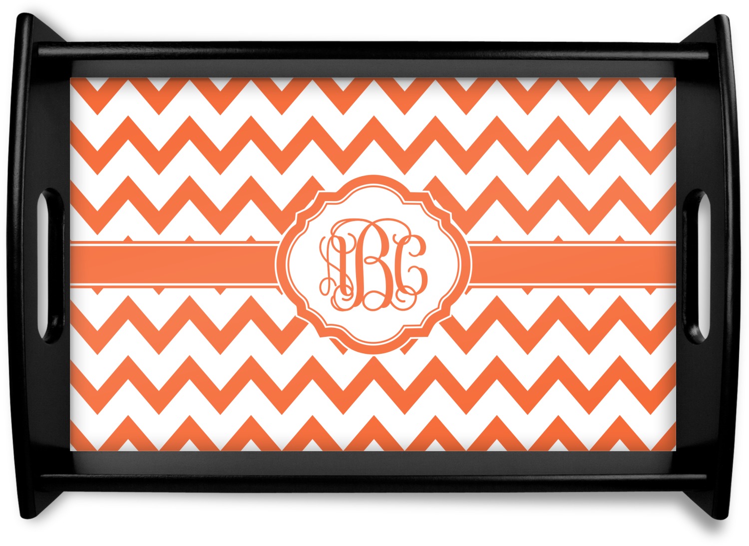 This serving tray with handles features square edges and two rounded sides, creating a very modern look. Each side is fabricated from a beautifully cut, natural wood. The bottom of the interior of the tray displays your customized design in bright, vibrant color. The tray is sold in both a black color and a natural wood look. Each variation of the wood serving tray has two sizes: Small, which is 14" x 10" x 2.25", and Large, which is 19.5" x 13.5" x 2.75".