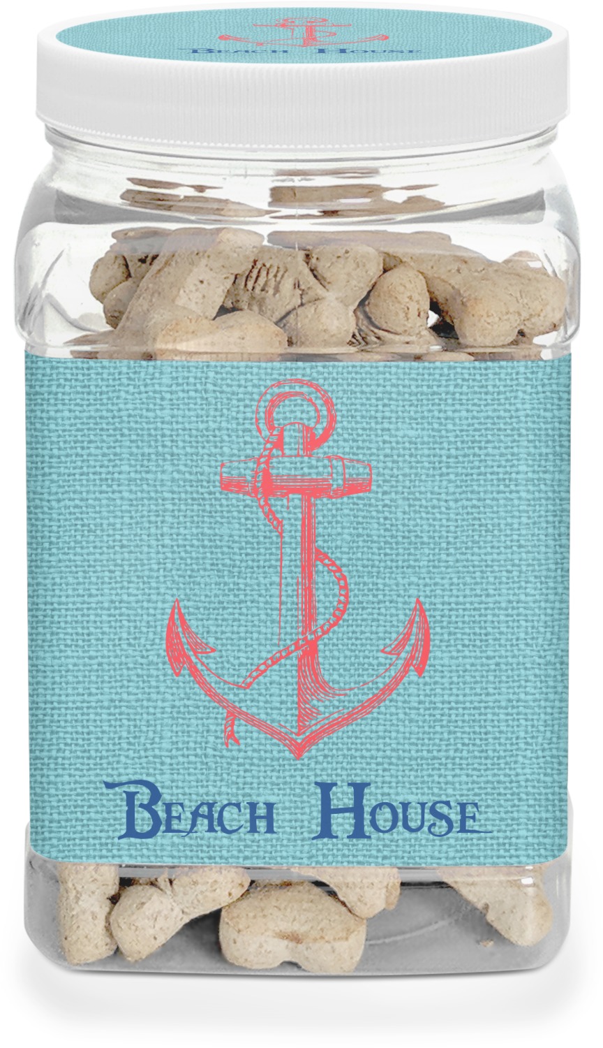 This half gallon jar, made from a sturdy plastic, is the perfect way to keep treats from any naughty pet paws, while still keeping them ready on hand for when your pup performs an impressive trick. This dog cookie jar features a screw-on, white lid that displays your personalized design on a vinyl sticker. We apply another customized sticker that wraps around the front and sides of the jar. Our dog treat jar also has indentations on the rear ends of the sides, which allows for convenient handling, and its square frame allows for easy storage.