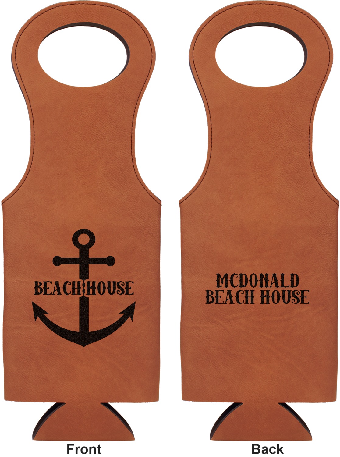 This wine carrier is made from a stunning leatherette, in a cognac-brown color. Strong, black stitching lines the sides of your wine bottle bag and provides extra durability. The interior is lined with a padded, black material to allow for a snug fit once your bottle is placed inside. At the top of this wine gift bag, you'll find two oval shaped handles that elegantly complements the rest of the bag's style. We provide you with the option of laser-engraving the front, or the front and back of your new personalized wine bag!
