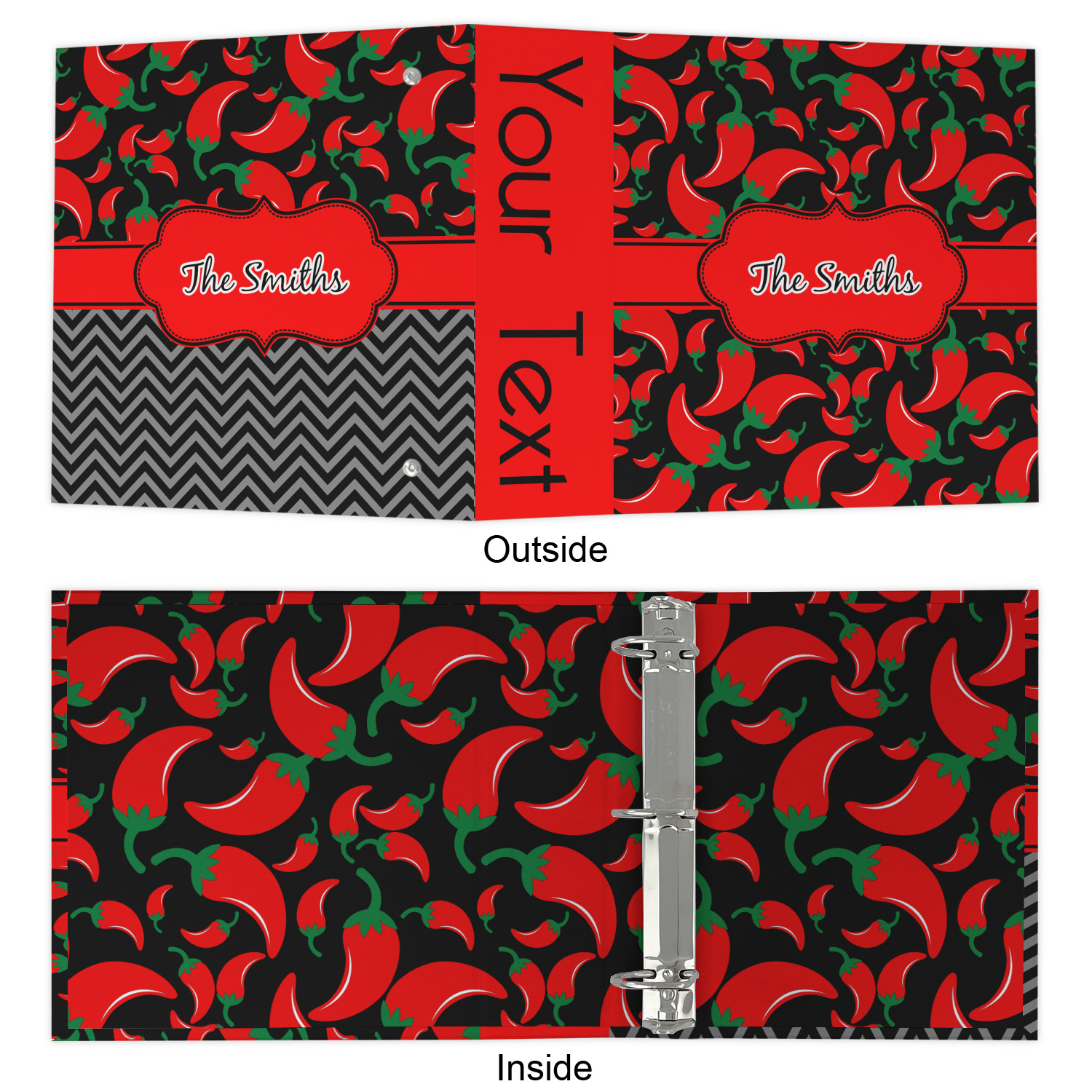 The outside is printed in 3 sections - front cover, spine and back cover - while the inside is printed in a full single print of your choice. The inside boasts a high quality nickel plated binder mechanism with a trigger opening function and is secured to the cardboard binder with posts and screws.