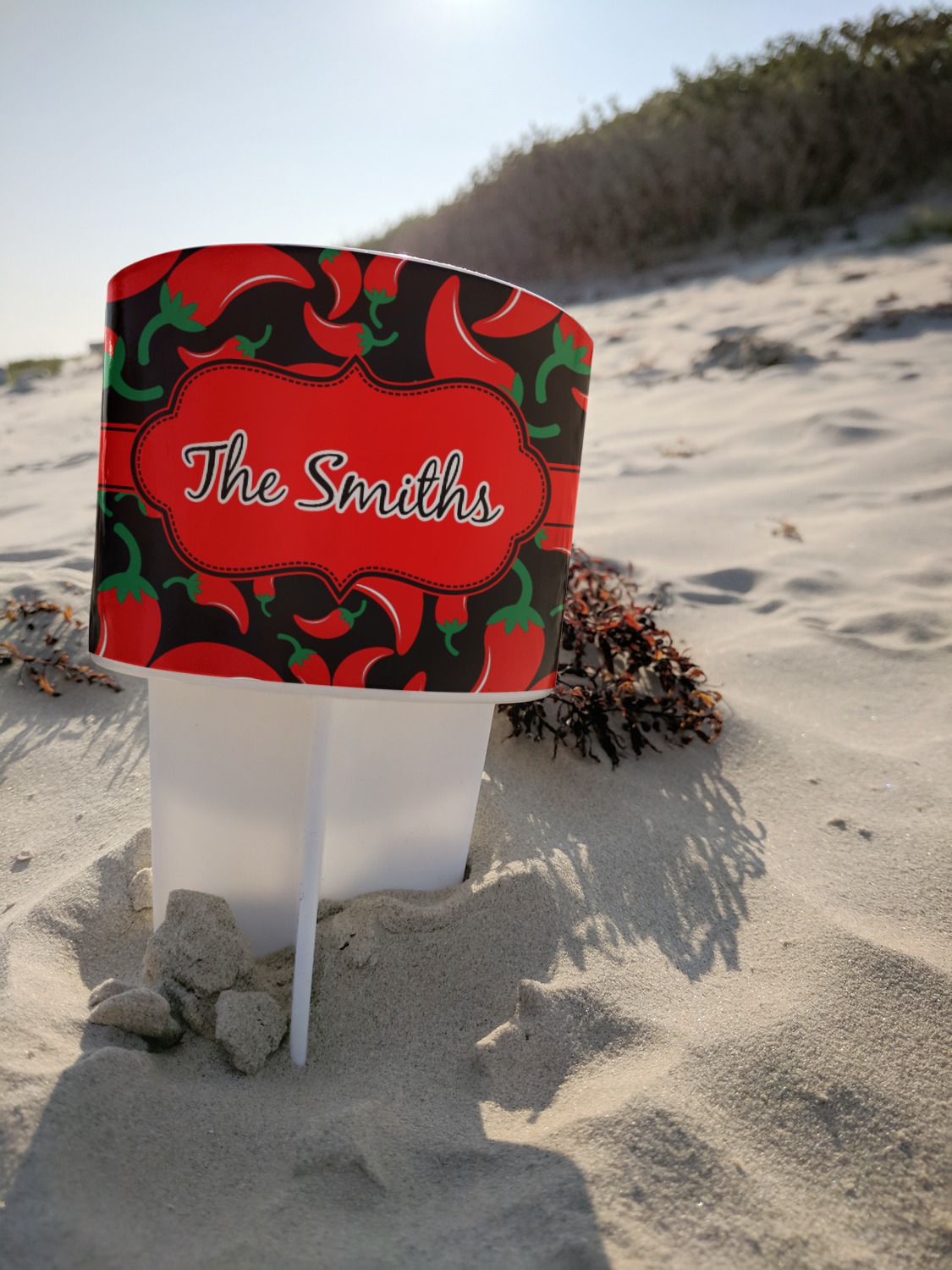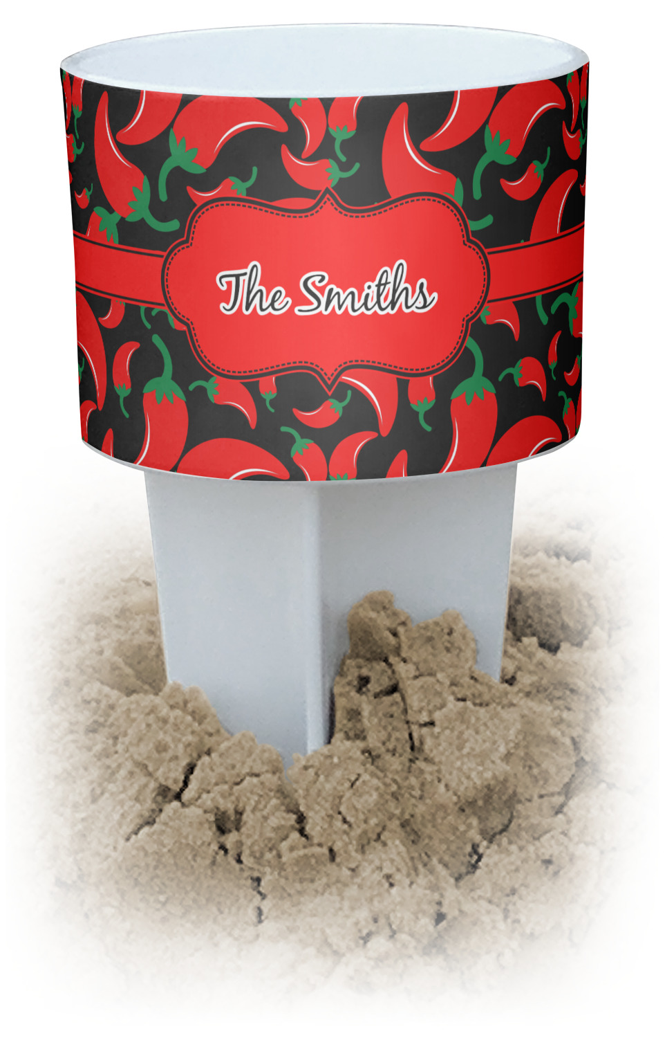 This cup holder has a large stake at its bottom that anchors it to the sand or ground below, while the cup holder rests above the stake. The entire drink holder is made of durable plastic and displays your customization around the cup holder portion. We sell these personalized beach spikers in two different colors: black and white.