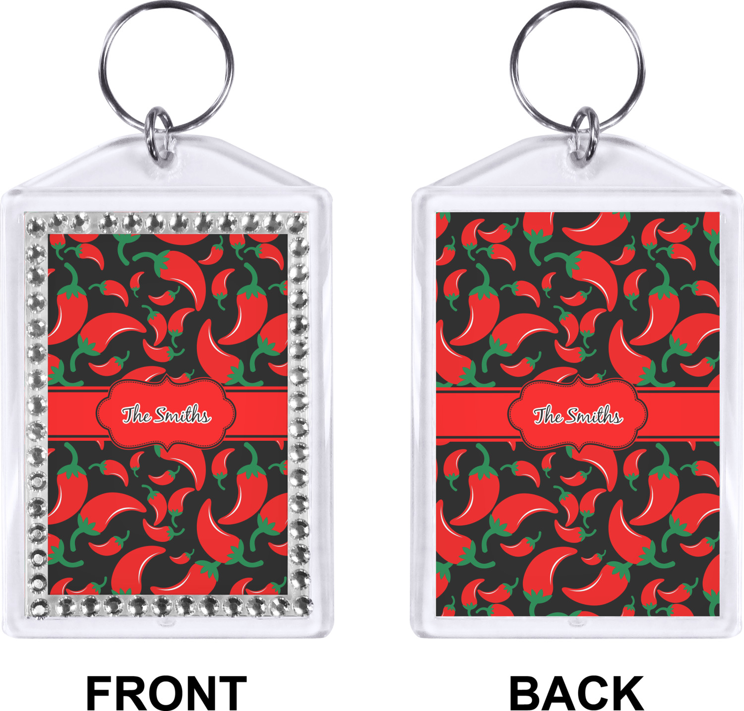 Our personalized keychains have a bold, rectangular shape, outlined by a series of shimmering rhinestones. A metal, split keyring is included with your purchase, and an additional metal hoop allows for attachment of the keychain to the split ring. This unique keychain measures at about 3.75 by 2.5 inches. We print your customized design(s) across both the back and front of this keychain.