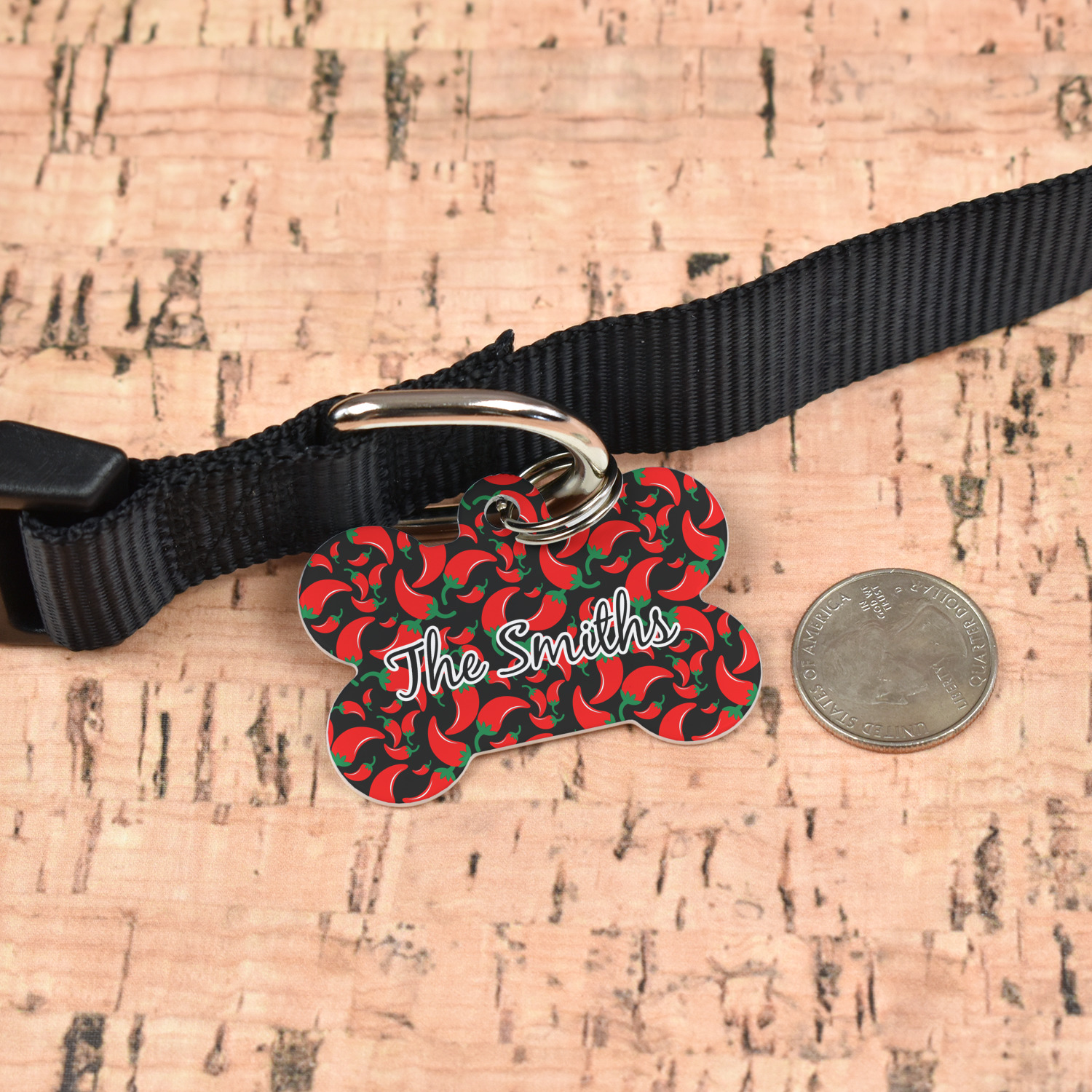 The small bone dog tag size is perfect to pair with our small dog collars, the large size pairs well with our large dog collars.