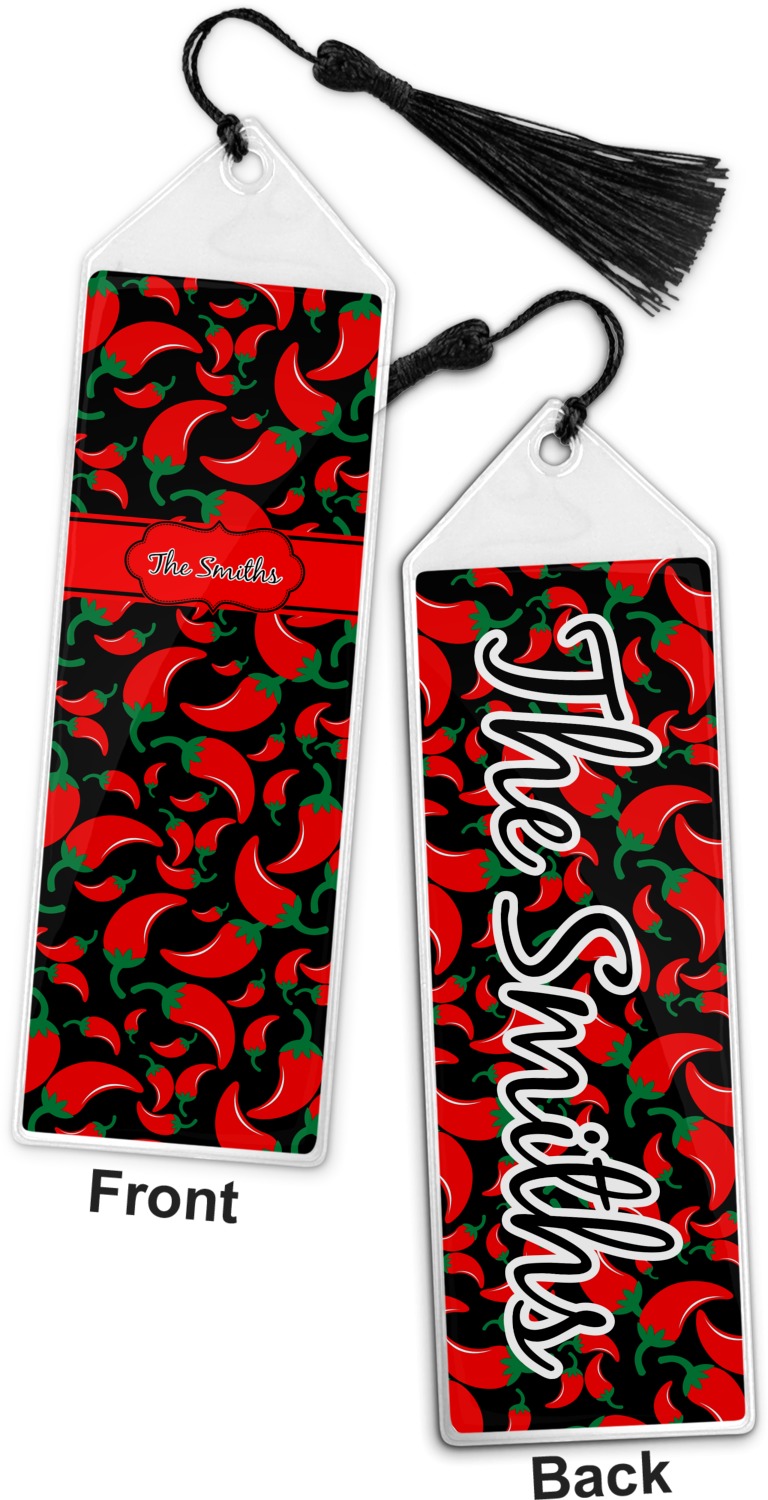 Your personalized bookmark is made of a sturdy, clear vinyl, and is approximately 7.5" x 2.25". We display your personalization on vinyl inserts that are placed on both sides. Accompanying each book marker is a black, fringe tassel that attaches to the reinforced, triangular header.