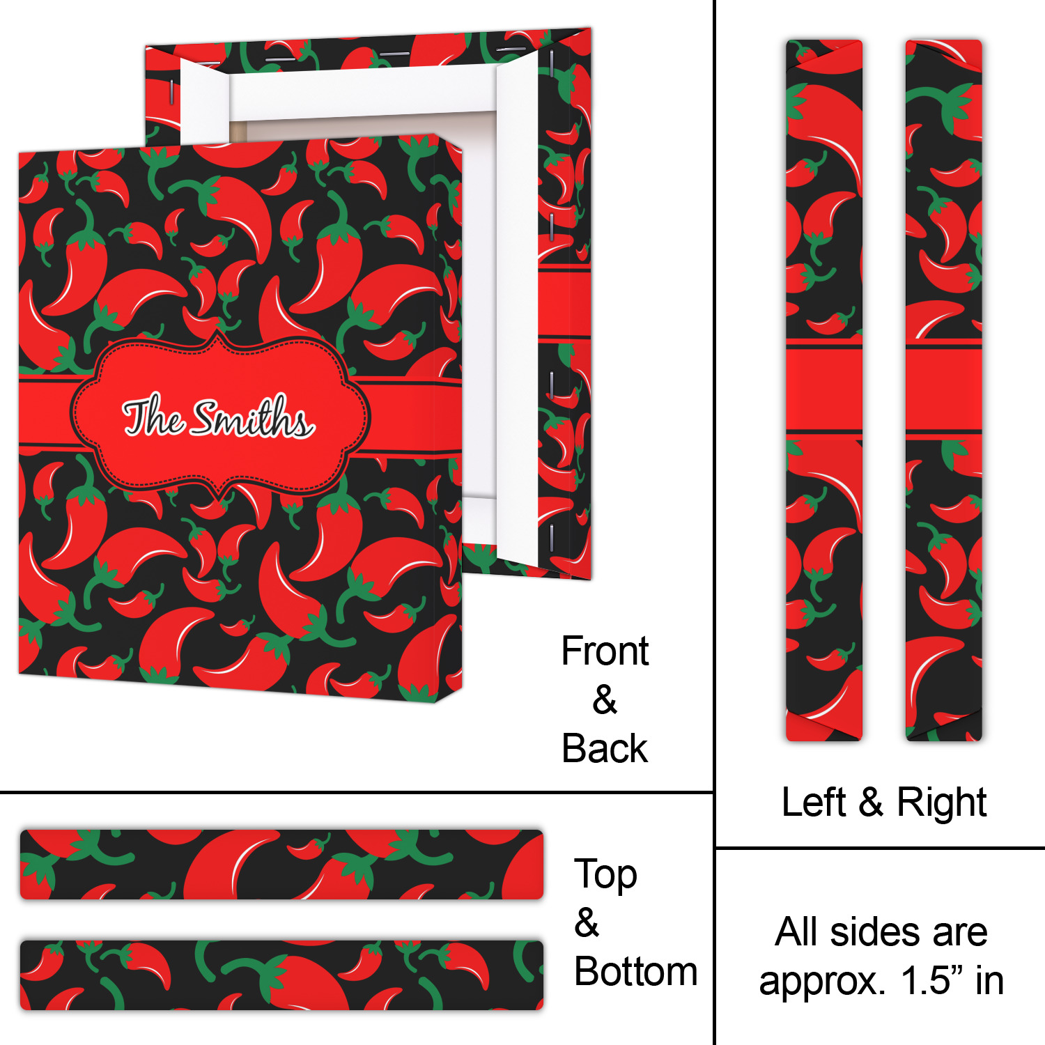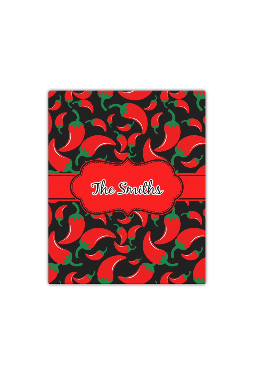 The chili peppers design is part of our fruits and vegetable collection. This design features red chili peppers in various sizes on a black background. The background can be changed to any color. I would recommend trying our white, gray, gold, teal or purple color as background choices.