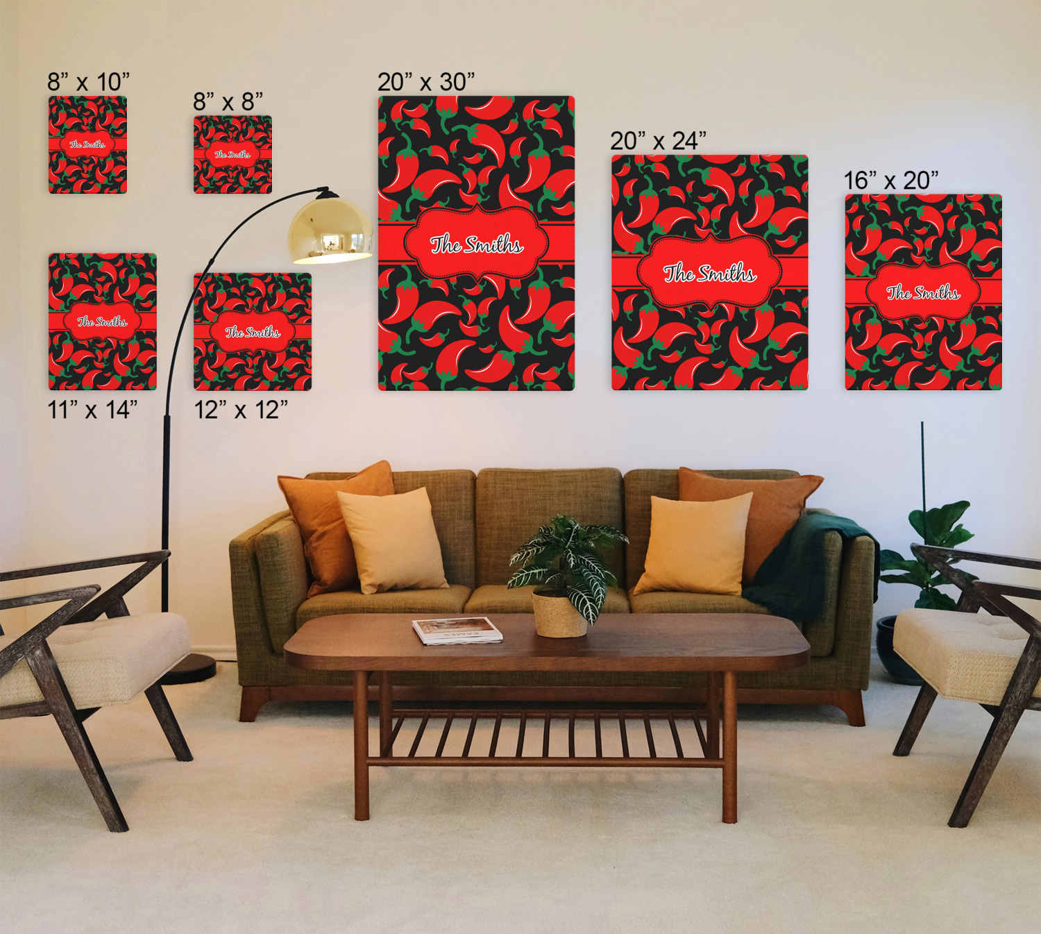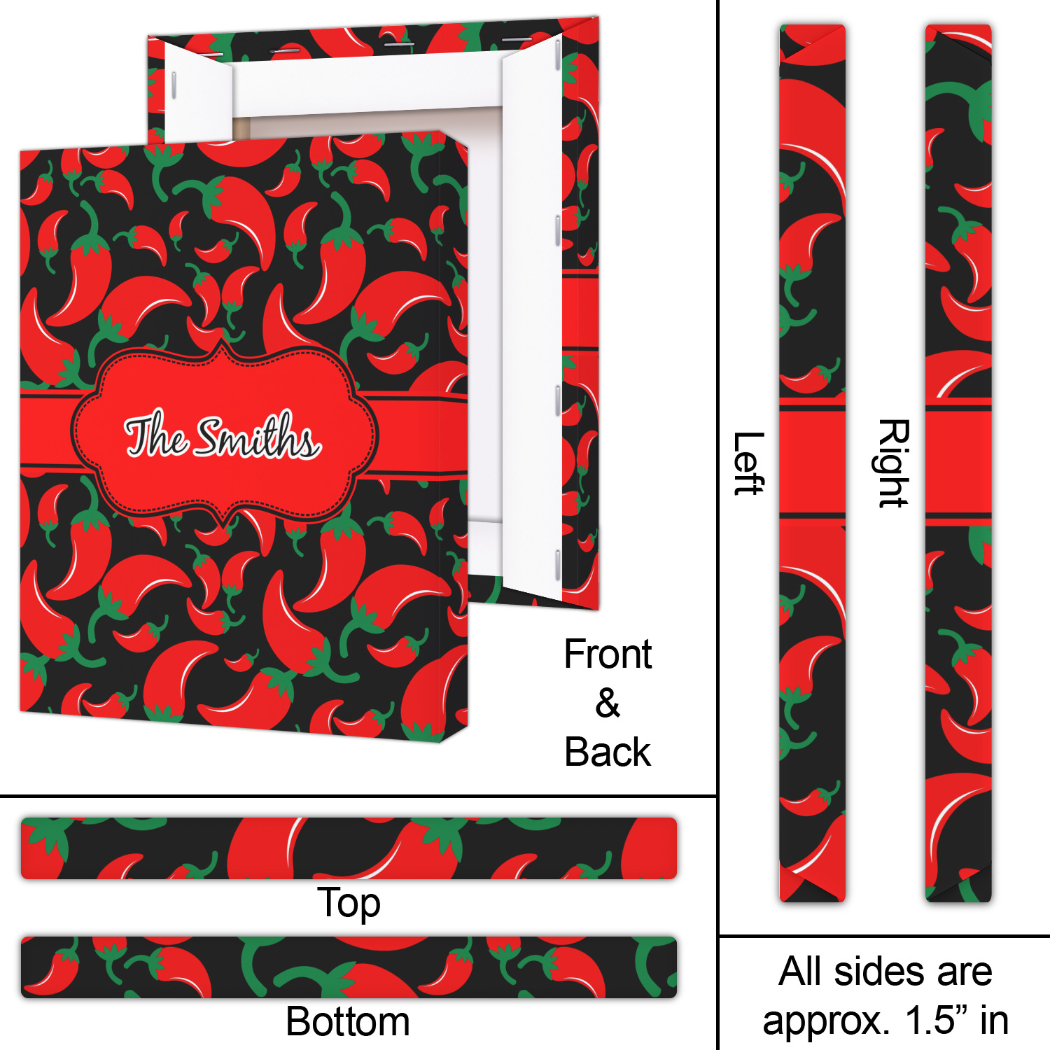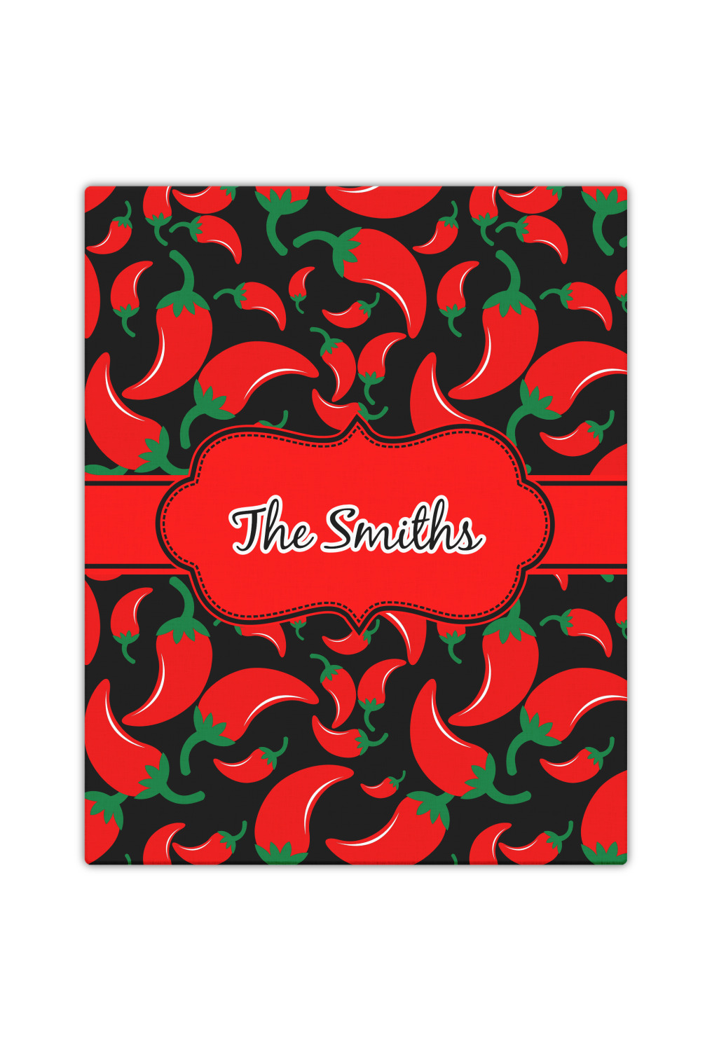 The chili peppers design is part of our fruits and vegetable collection. This design features red chili peppers in various sizes on a black background. The background can be changed to any color. I would recommend trying our white, gray, gold, teal or purple color as background choices.