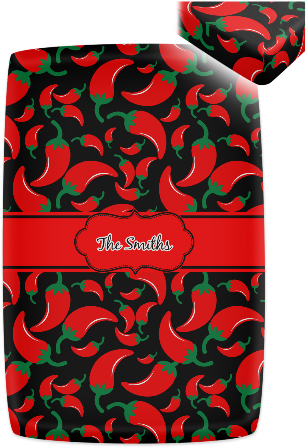 The chili peppers design is part of our fruits and vegetable collection. This design features red chili peppers in various sizes on a black background. The background can be changed to any color. I would recommend trying our white, gray, gold, teal or purple color as background choices.