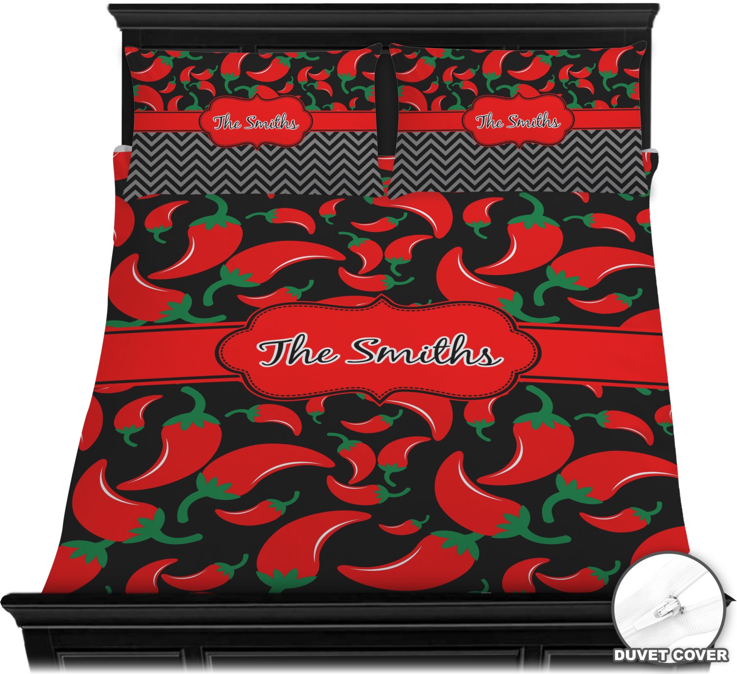 The chili peppers design is part of our fruits and vegetable collection. This design features red chili peppers in various sizes on a black background. The background can be changed to any color. I would recommend trying our white, gray, gold, teal or purple color as background choices.
