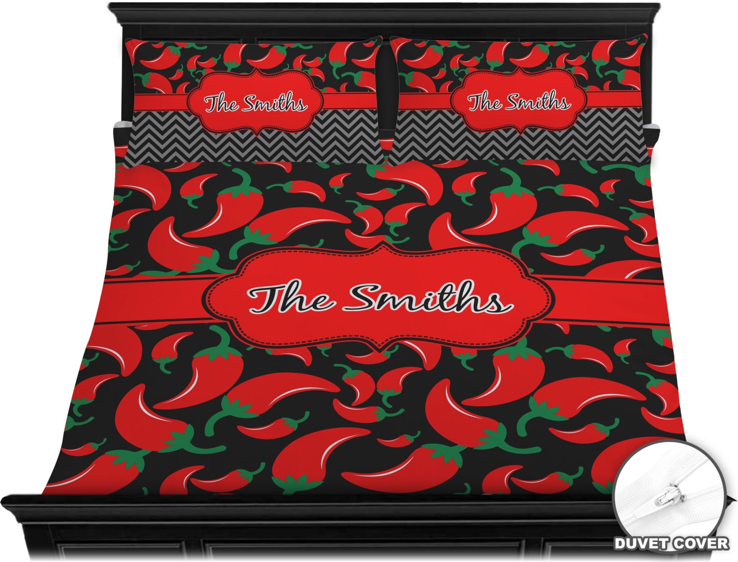The chili peppers design is part of our fruits and vegetable collection. This design features red chili peppers in various sizes on a black background. The background can be changed to any color. I would recommend trying our white, gray, gold, teal or purple color as background choices.