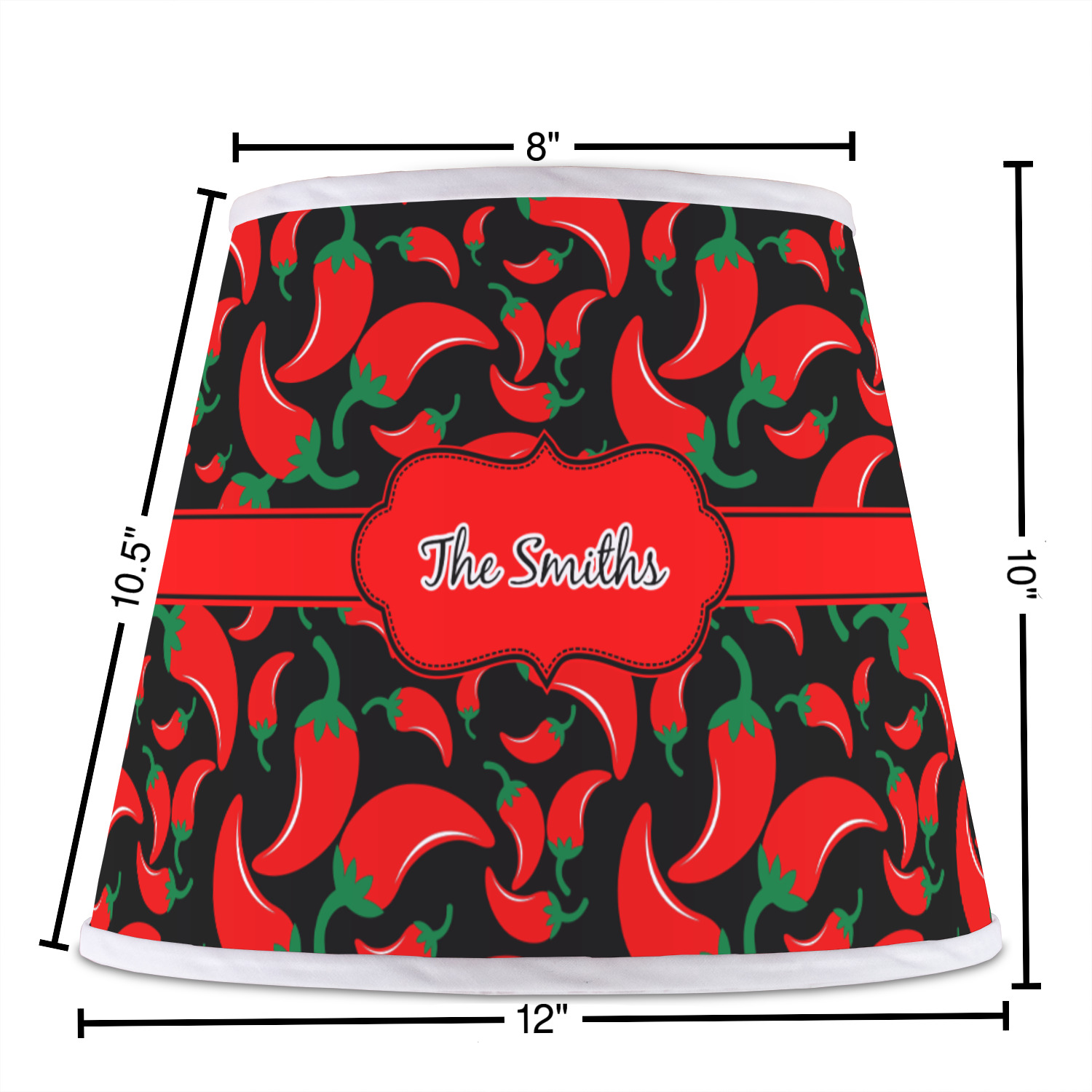 The base of this lampshade is 12 inches in diameter, and the top spans 8 inches in diameter. The total height of the lampshade is 10 inches. The angled nature of this custom lampshade concentrates the light, making it ideal for smaller spaces. This lampshade is made of matte, polyfilm, and displays your customization in its middle. The top and bottom of this colorful lamp shade are lined with a white fabric ribbon (which can be replaced with black inside the design studio) which frames your design and creates a sophisticated finish. As an UNO fitter lampshade, this unique lamp shade will fit a variety of bases.