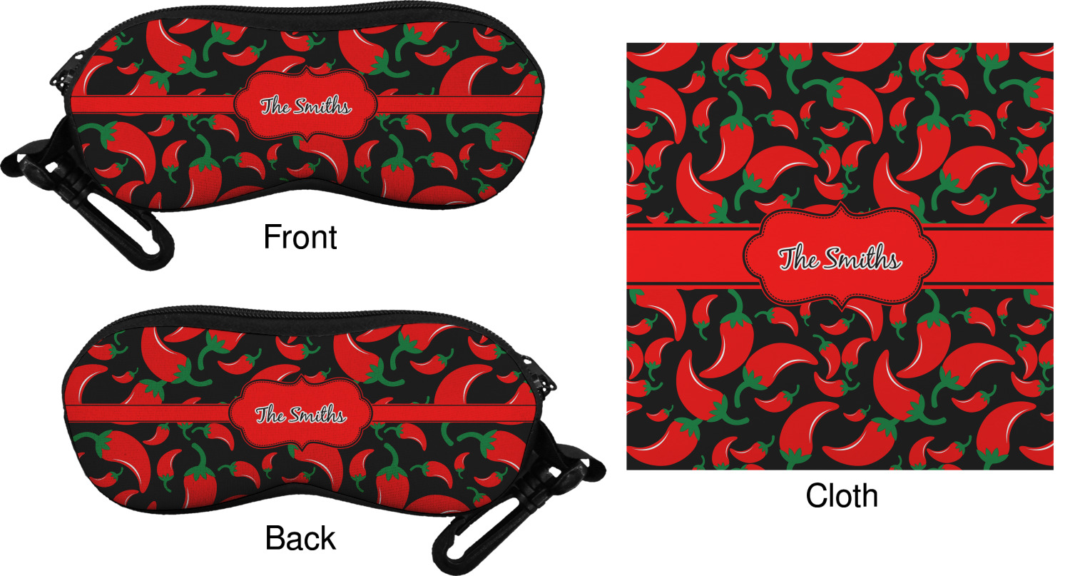 The cases have the design on both sides, a black zipper, and clips for hanging on a belt buckle or purse strap and also include matching lens cloths.