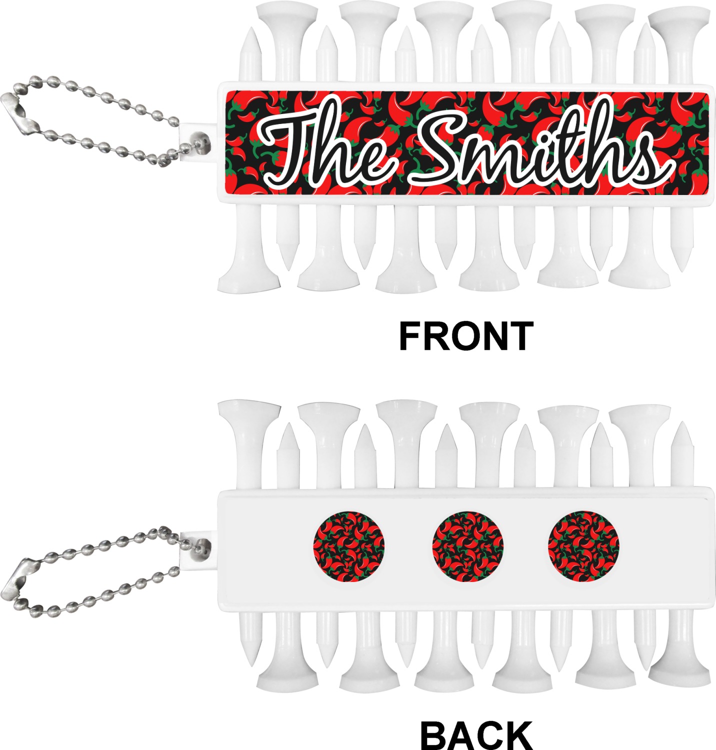With 12 tees on a lightweight, portable key chain, it almost ensures a great 18 holes. Our tees are made of white plastic and are a little over 2". Design the front and the back of the golf tee holder. Pick from over a hundred designs, colors, and personalization styles! The set even comes with three removable ball markers as well!