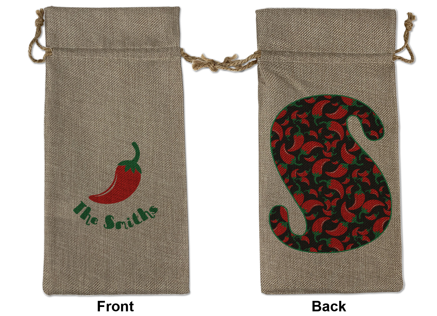 We sell our Burlap Gift Bags in 3 variant sized bags. Made with burlap polyester, each personalized bag can be secured with a twine drawstring pull. Your custom design is available to print on one side or both sides - completely up to you! The sizes of the bags measure approximately 4.5" x 6.5" for the smallest size, 6.5" x 8.0" for the medium size, and 6.5" x 13.5" for the large-sized bag.