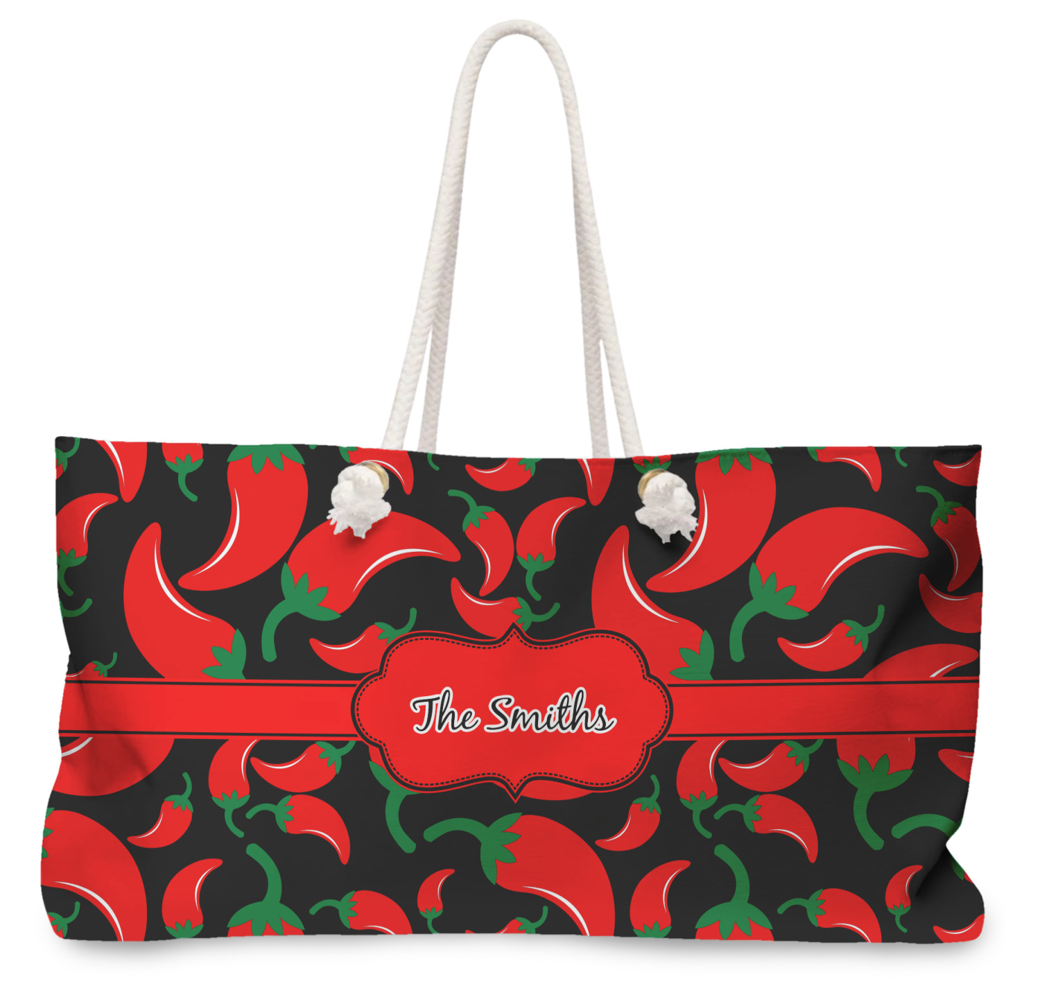 Our oversized weekender tote with rope handles is perfect for your weekend at the beach or on the town. This large tote are 24" W X 13" H, with a 5" gusset and a 27" thick rope handles with a knot that is put through a grommeted brass hole.