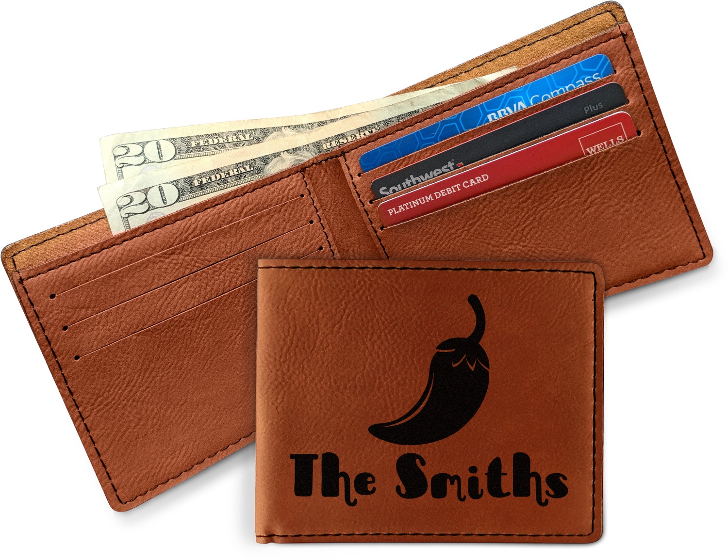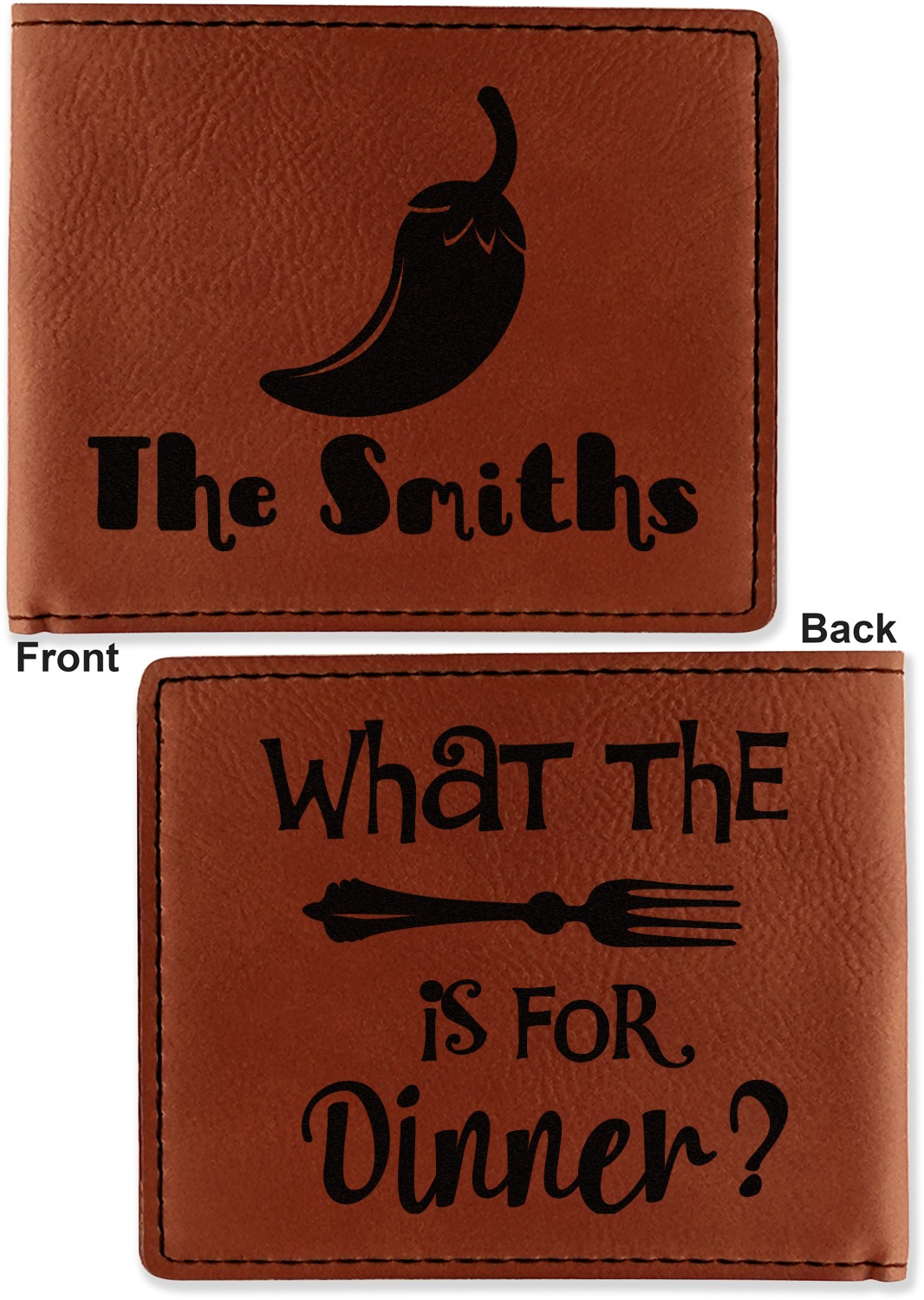 Your bifold wallet will be personalized by laser engraving, which will be a black color on the wallet. Choose a graphic, text, or monogram to personalize your wallet. There are thousands of choices in our design center.