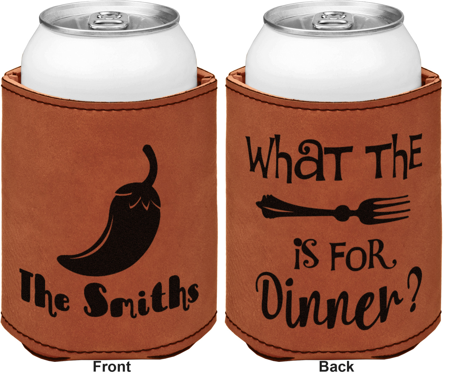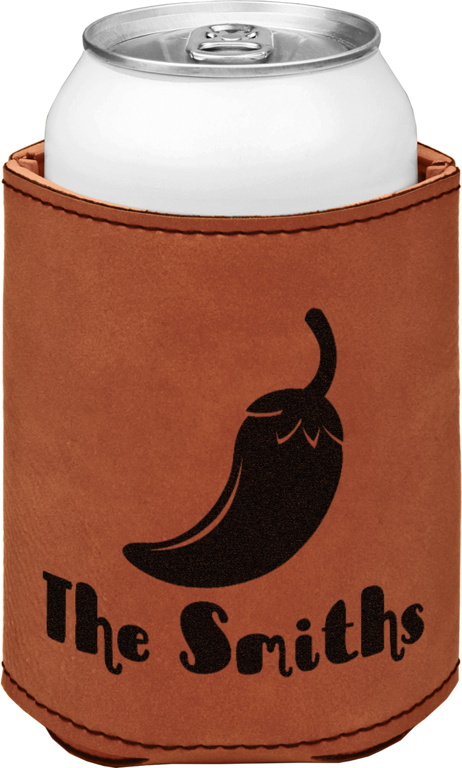 This can sleeve is made from a cognac-brown leatherette and stitched with a sturdy, black thread. A slim padding lines the inside of your can sleeve to allow for a better fit once your drink is inserted. The sleeve itself measures at 4 by 4.5 inches, allowing this custom can sleeve to accommodate most canned drinks. Your personalized design can be engraved on the front and back, or solely the front. When laser-engraved, your design appears as a black coloration which contrasts the leatherette nicely.