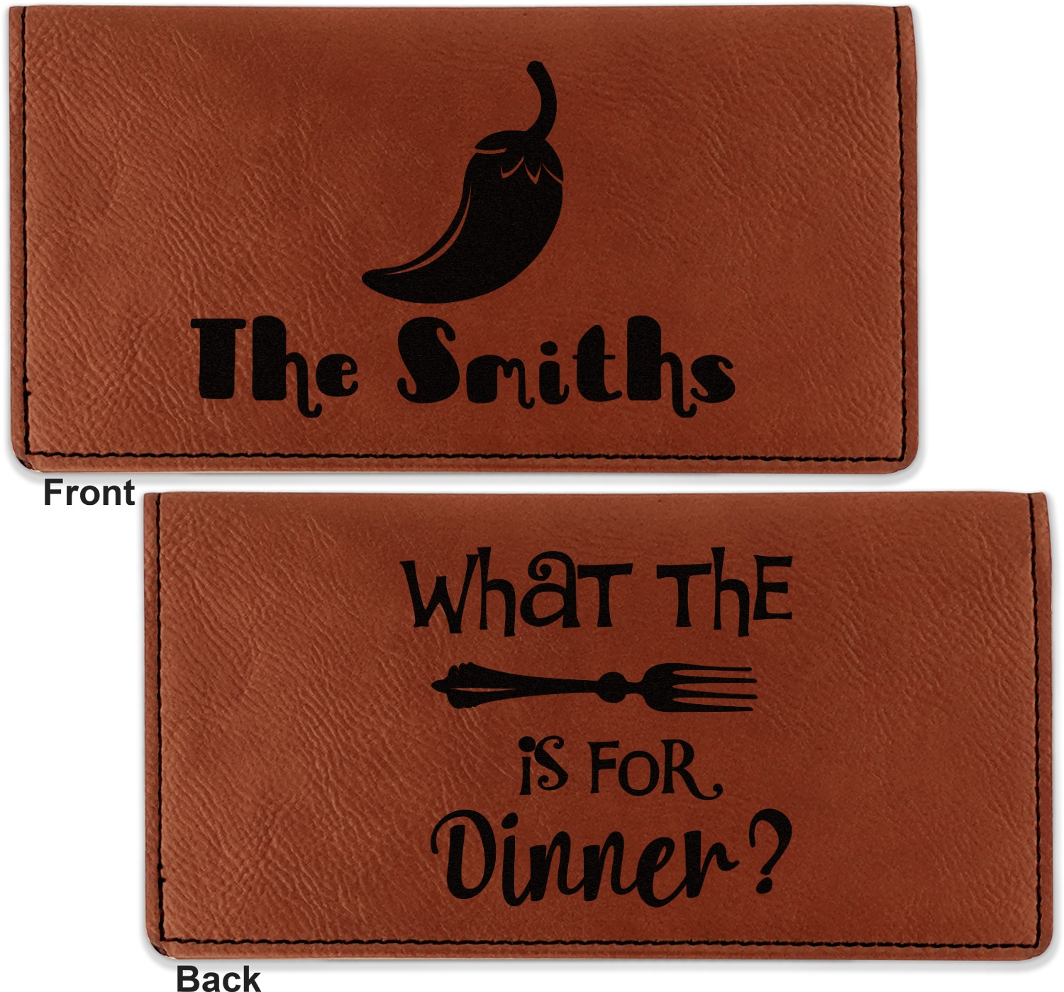 Go into our design center to start personalizing. Your checkbook cover will be laser engraved, making the graphic or text a black color. Choose a fun saying, monogram, or font to go on your checkbook cover. You have the opportunity to do it double or single sided.