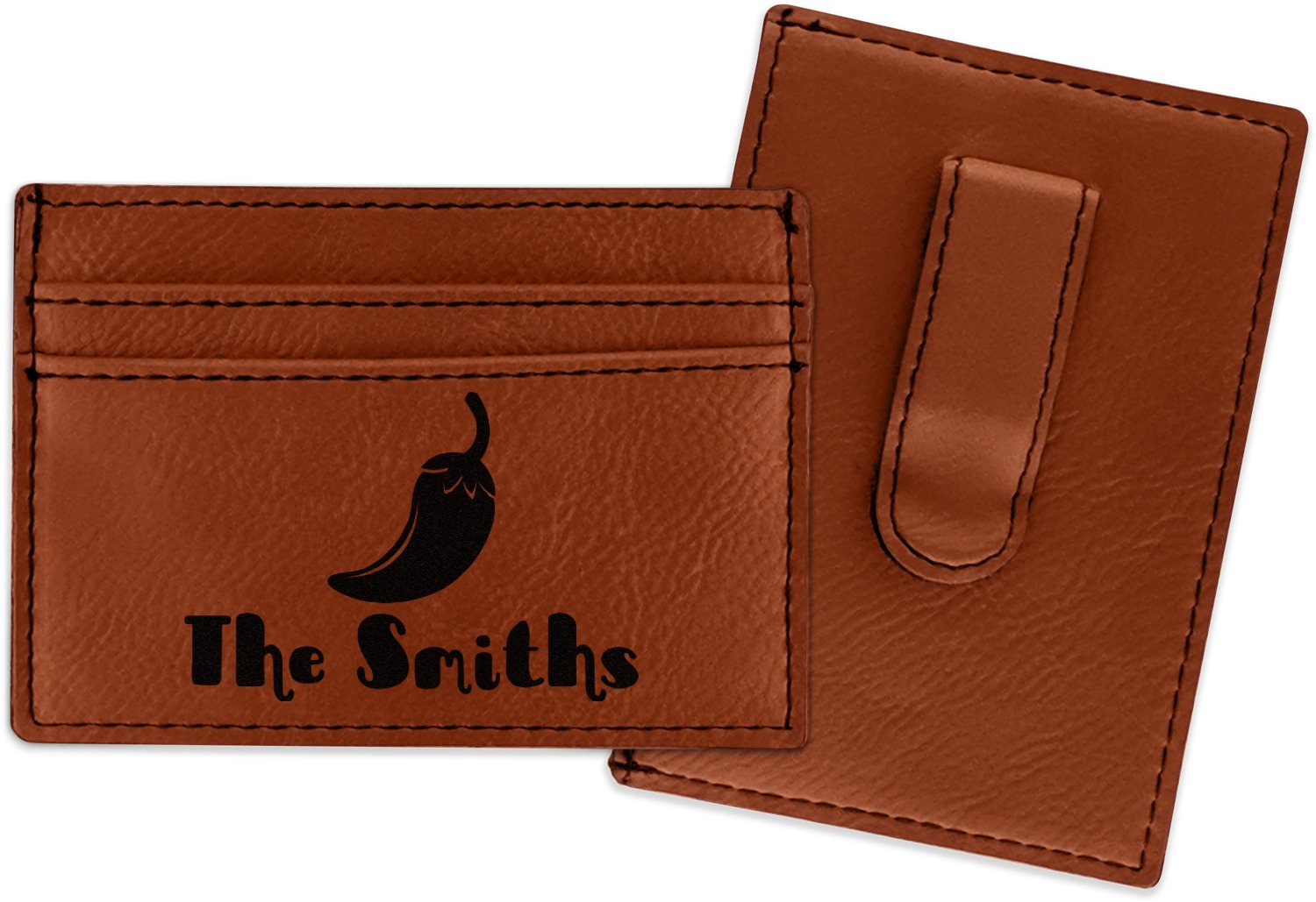Made from a smooth brown leatherette material, these money clip wallets are the perfect accessory. They measure at approximately 4" x 2.75". On one side there is a money clip where you can slip in your cash. On the other side are three card slots for an ID and credit card or two. The money clip wallet will be laser engraved with your design on the side with the credit card slots. The graphic will come out as a black color.