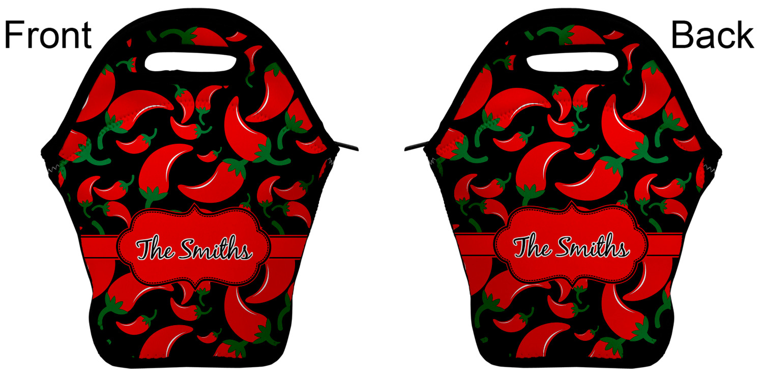 Our personalized lunch bags are made from a strong neoprene, and secure with a zipper closure that lines the top of the bag.The edges of the neoprene are sewn together with a heavy duty stitch, adding to the durability of the bag. The is accompanied by a reinforced handle at its top, for the easy transport of your lunch. We display your personalization across both the front and back of this neoprene lunch bag, while the remaining sides are a sleek black in color. Each bag measures at 13.5 inches tall, and 11.5 inches wide.