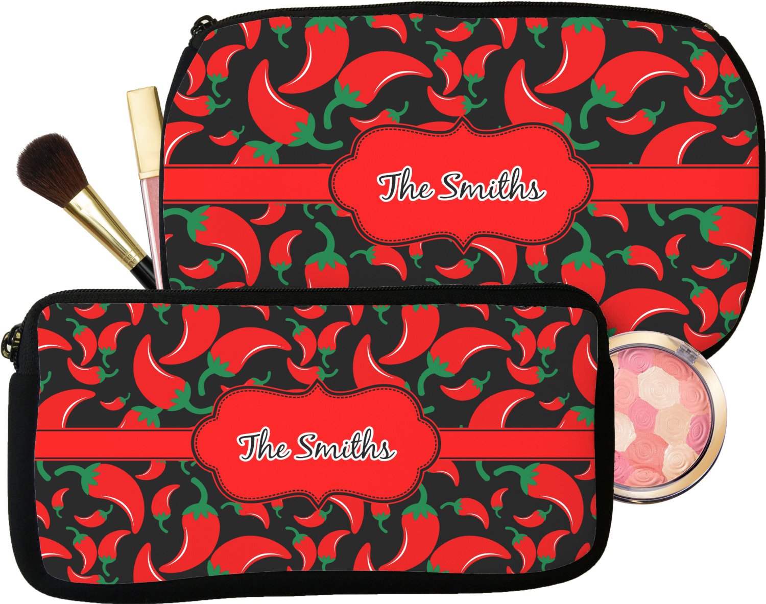 Our personalized makeup bags are available in many different designs, patterns and colors - so you are sure to find one that will love. They are made of neoprene (same material as wet-suits) and thus are water resistant, so spillages in your makeup bag will not end up all over you purse. They are customized on one side and are black on the other side and the zipper is black as well.